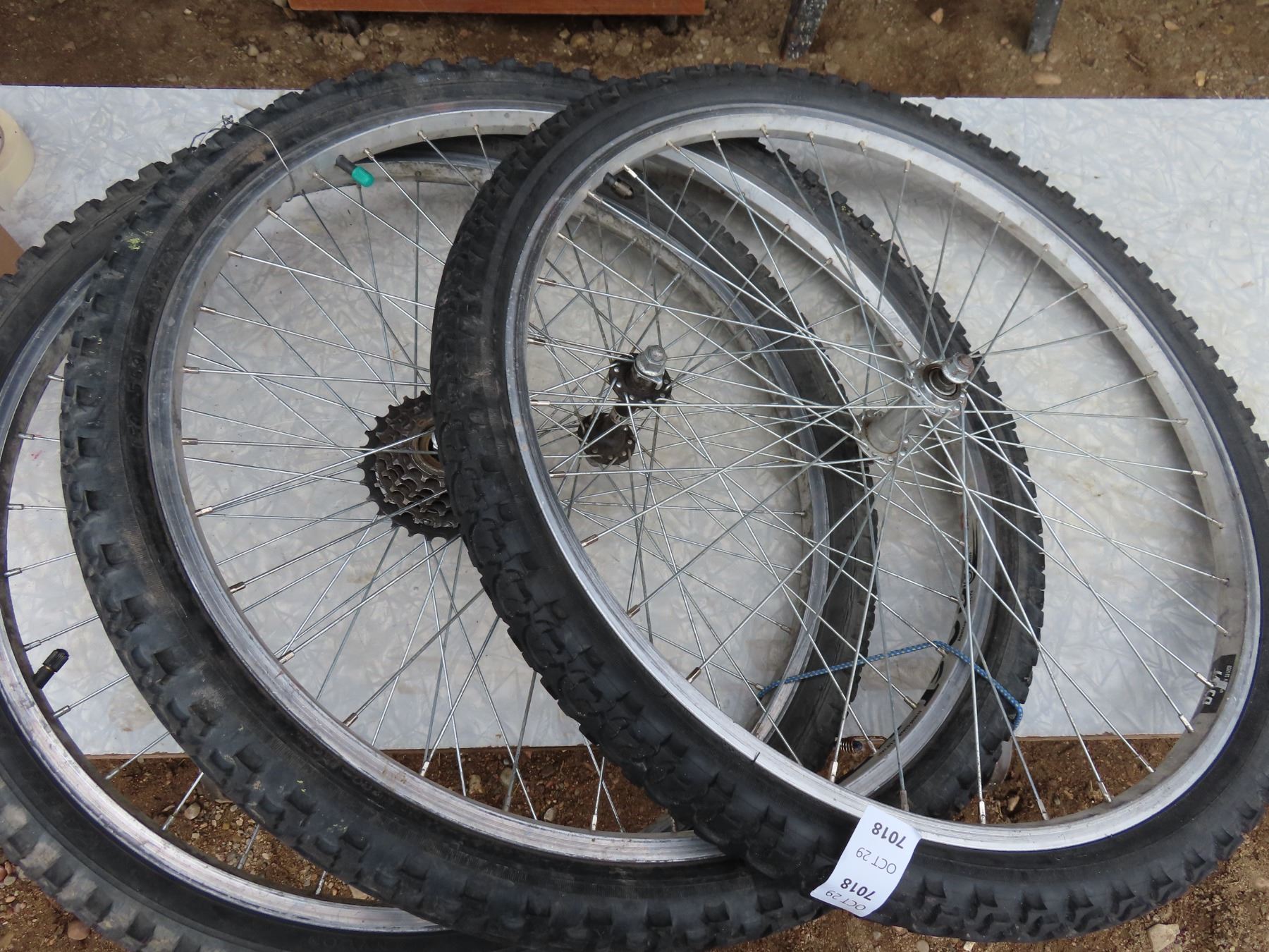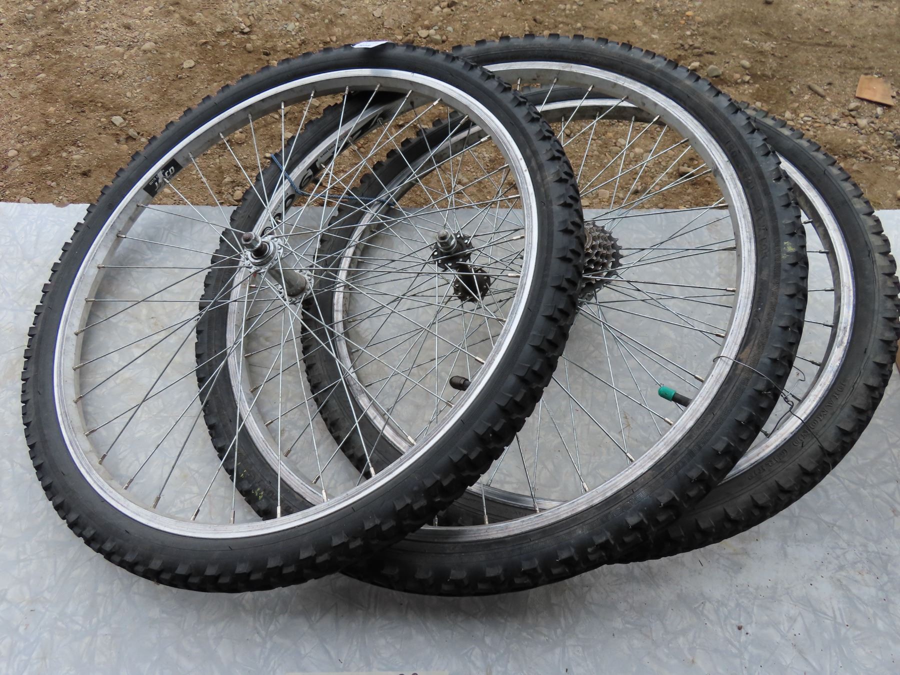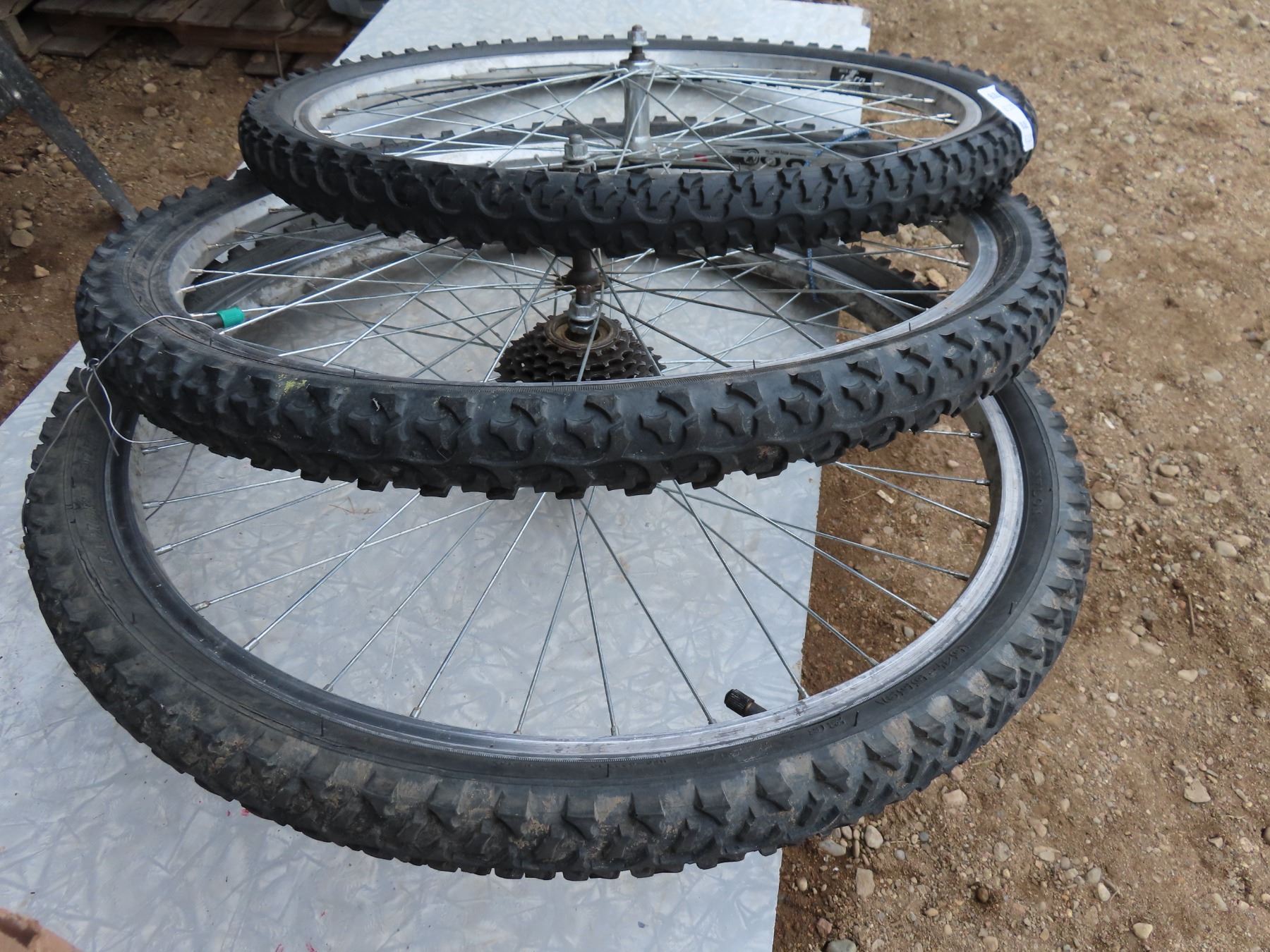 set of three bicycle wheels one with gears