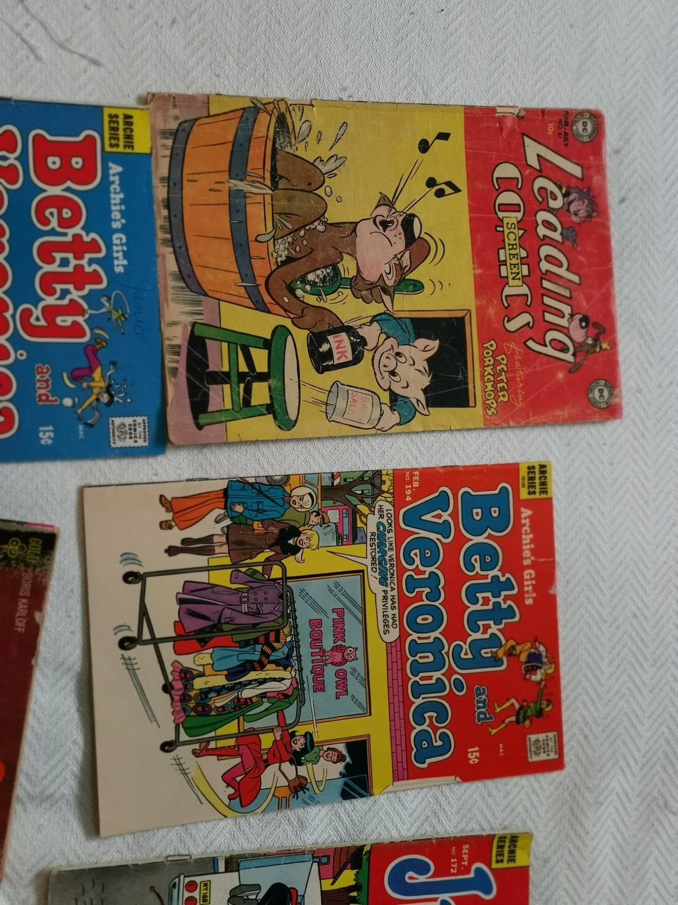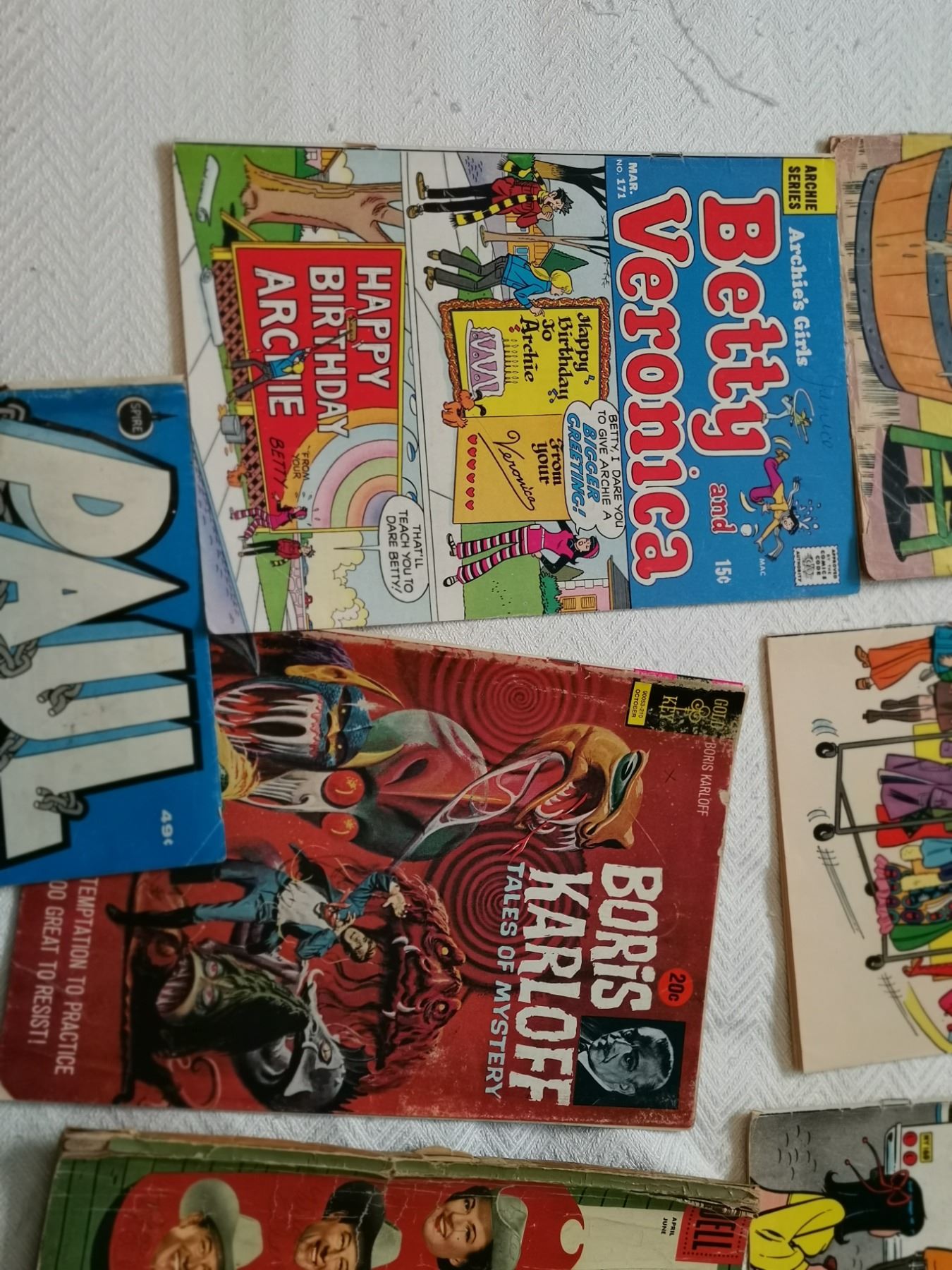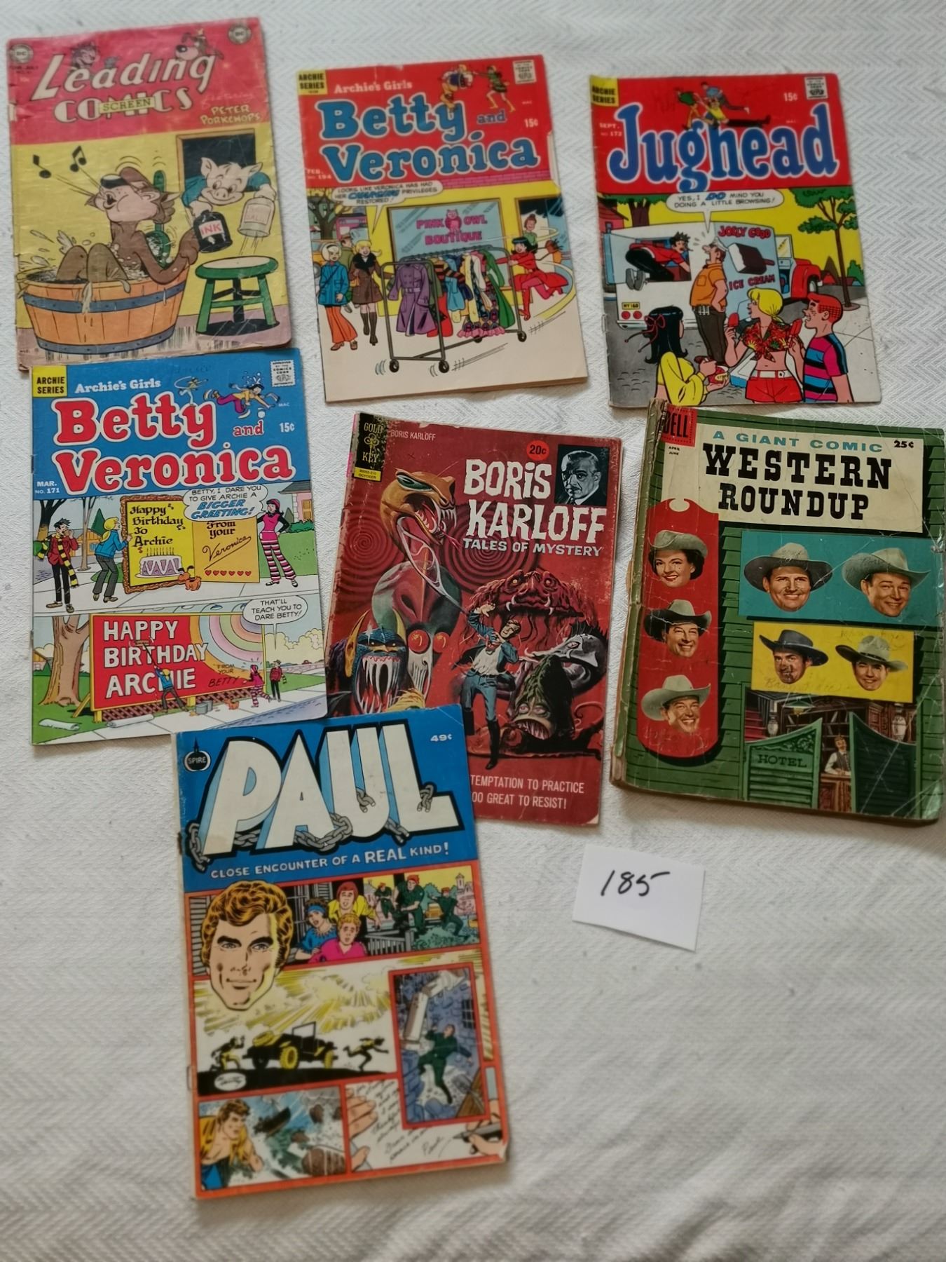 seven old comics 10 cent, 15 cent, 20 cent, 25 cent, 49 cent