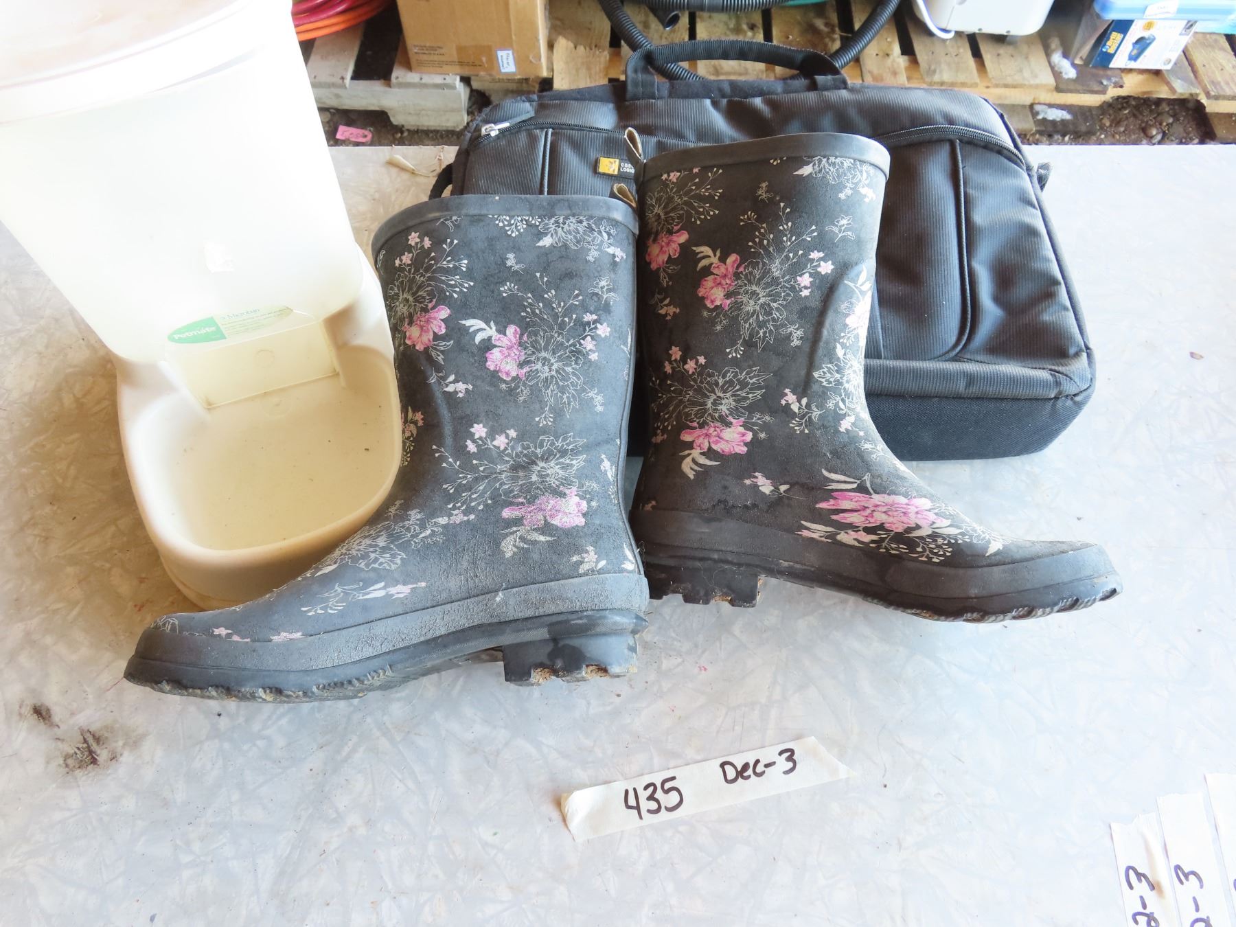 size 8 rubber boots , dog dish , logic carry case