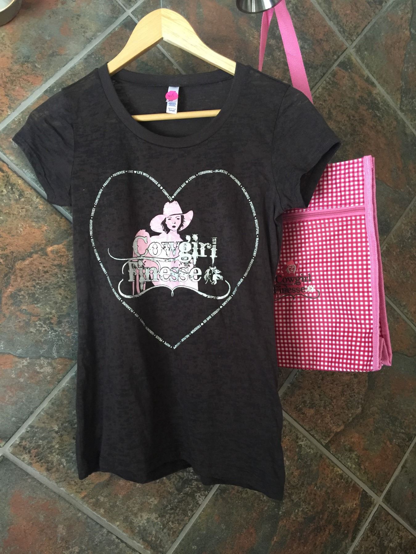 size XL/chocolat burnout t-shirt/Cowgirl Finesse logo/text around heart is "Cowgirl Team Sentiments"/Horses are, loyal, forgiving, majestic, inspiring, calming, powerful, beautiful, magnificent, breathtaking, spirit, grace, dreams. Horses give us, freedom, release, therapy, hope, peace, serenity, sanity, joy, pleasure, strenth, courage, comfort, warmth, faith, friendship, trust, confidence, passion, love. Life with horses is complete./COWGIRL FINESSE FINESSE TOTE BAG