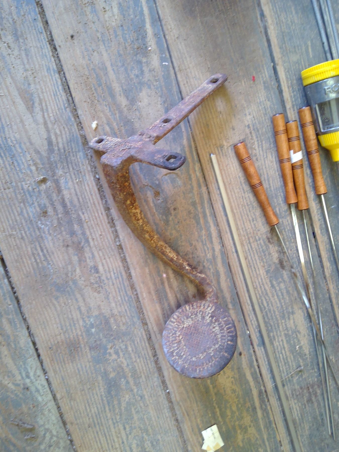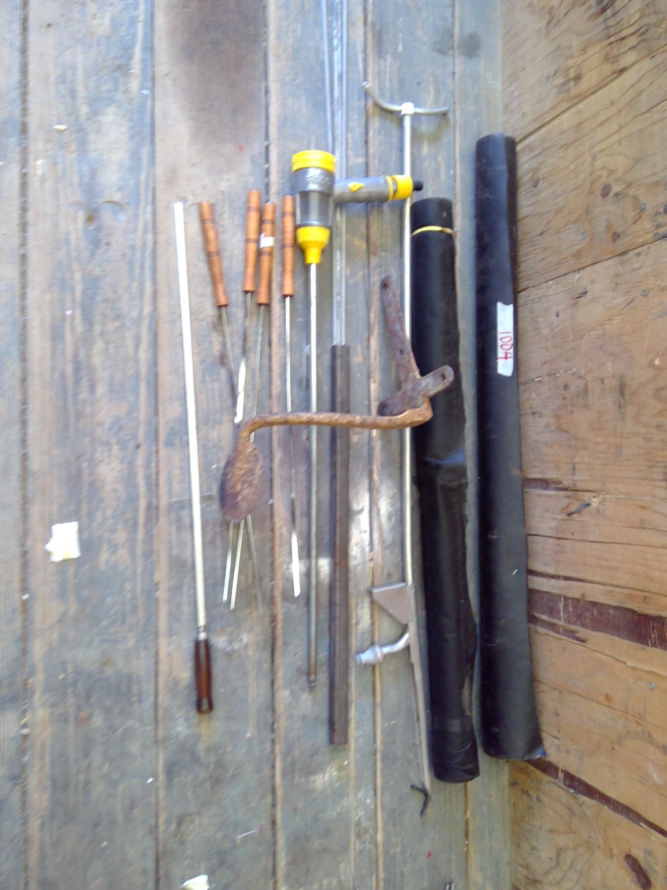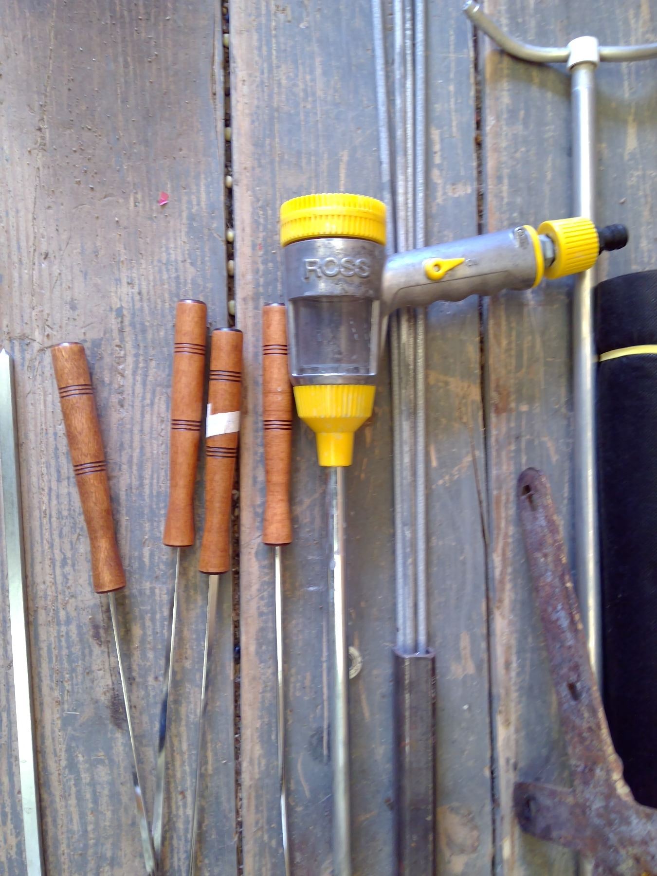 sprinkler, applicatro, scewers, landscape fabric, tar paper and vintage buggy step