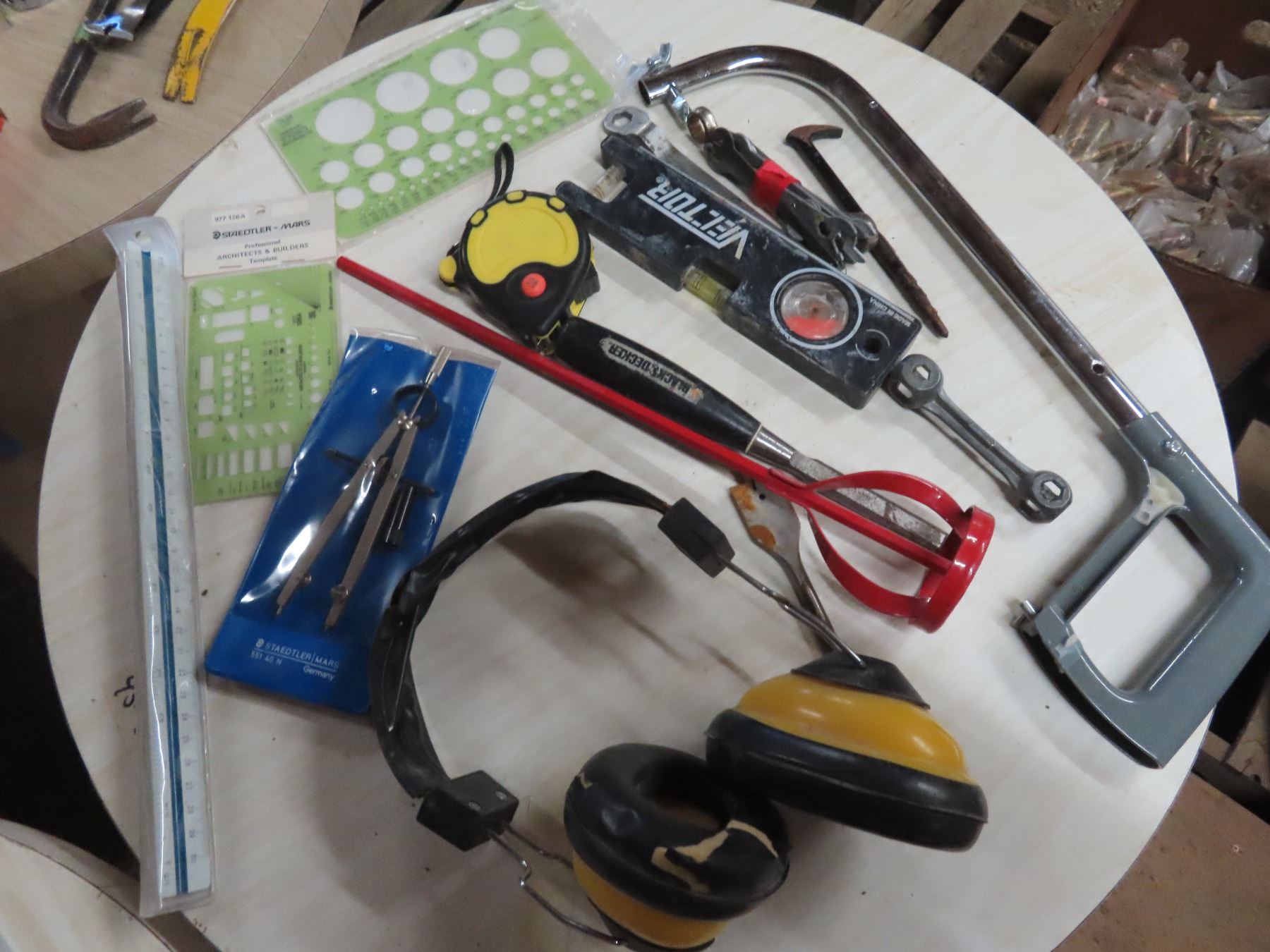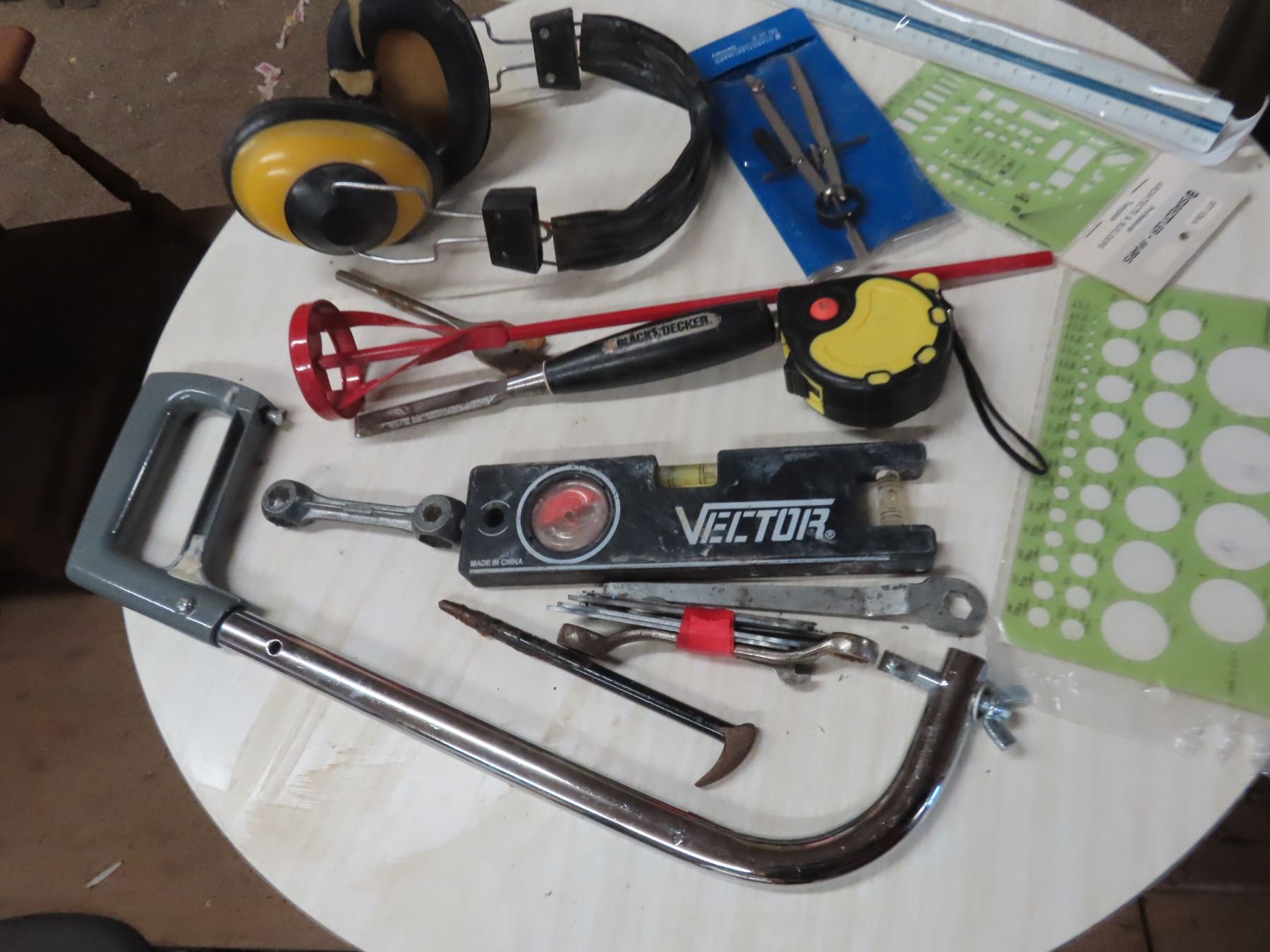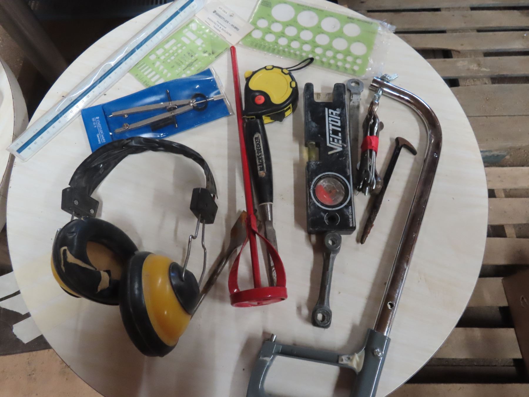 tape measure , level , paint mixer , hack saw , caligraphy items