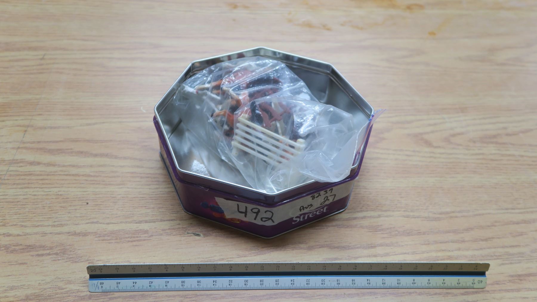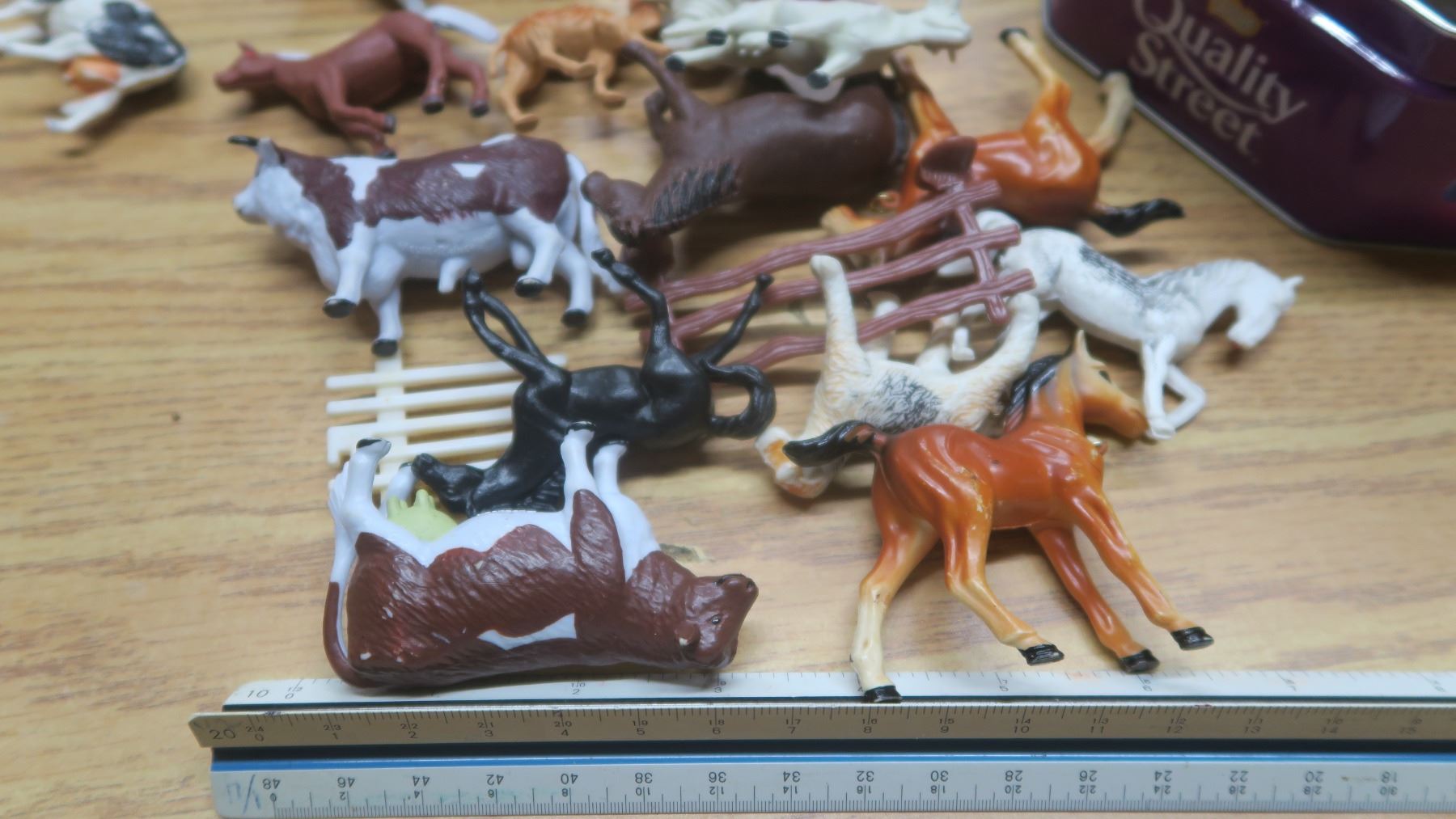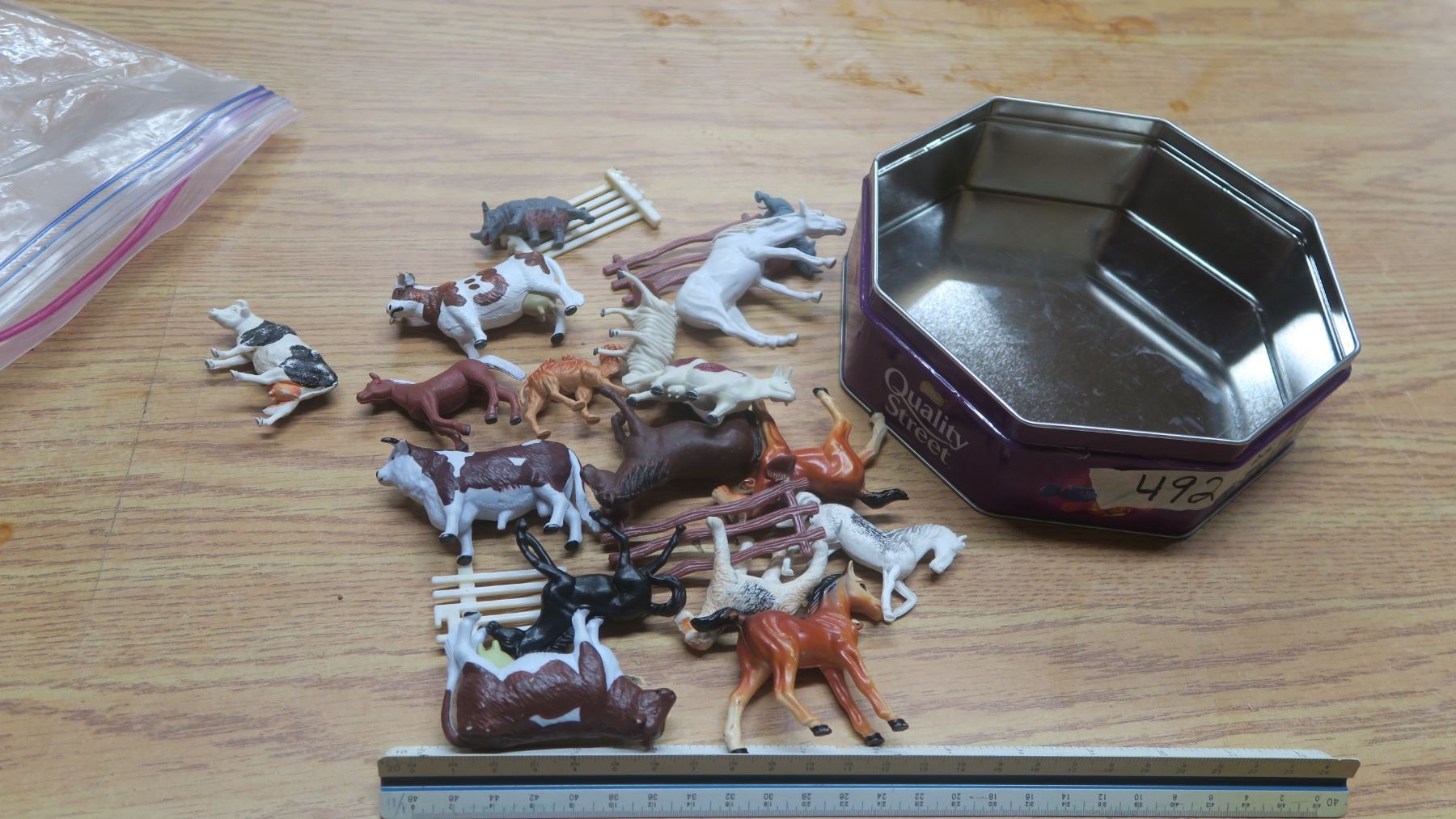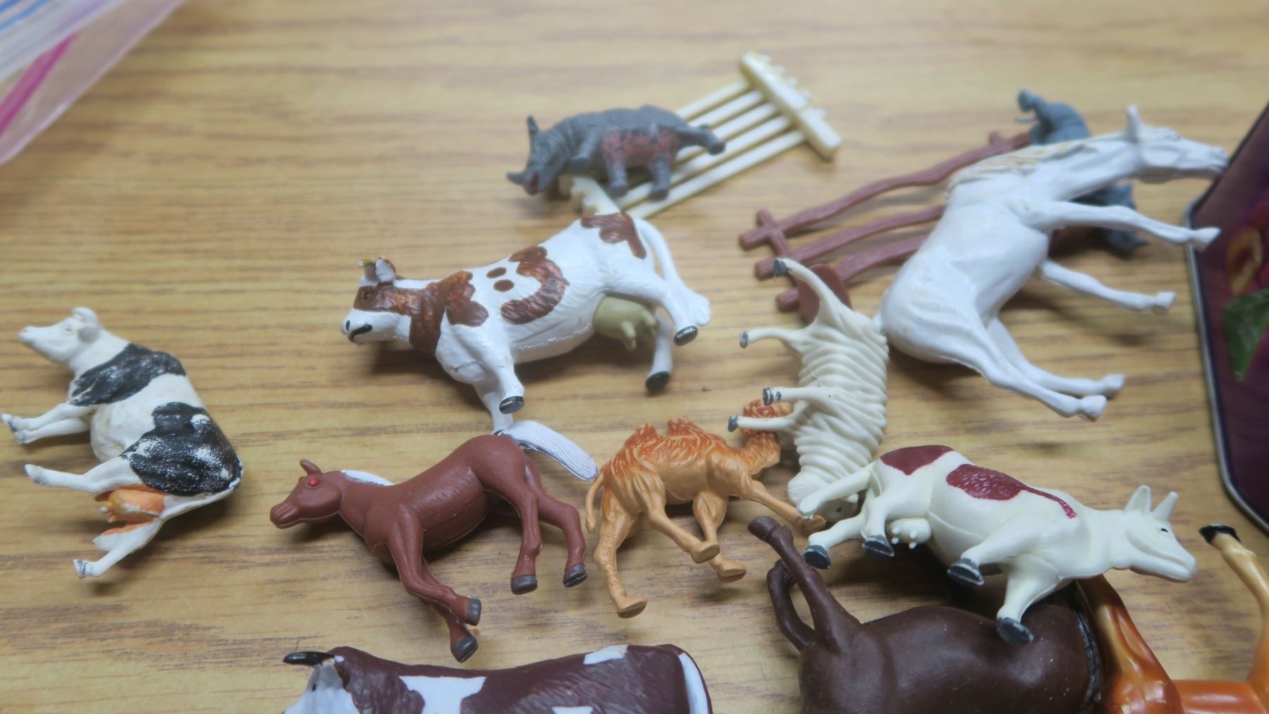 tin of plastic animals.
