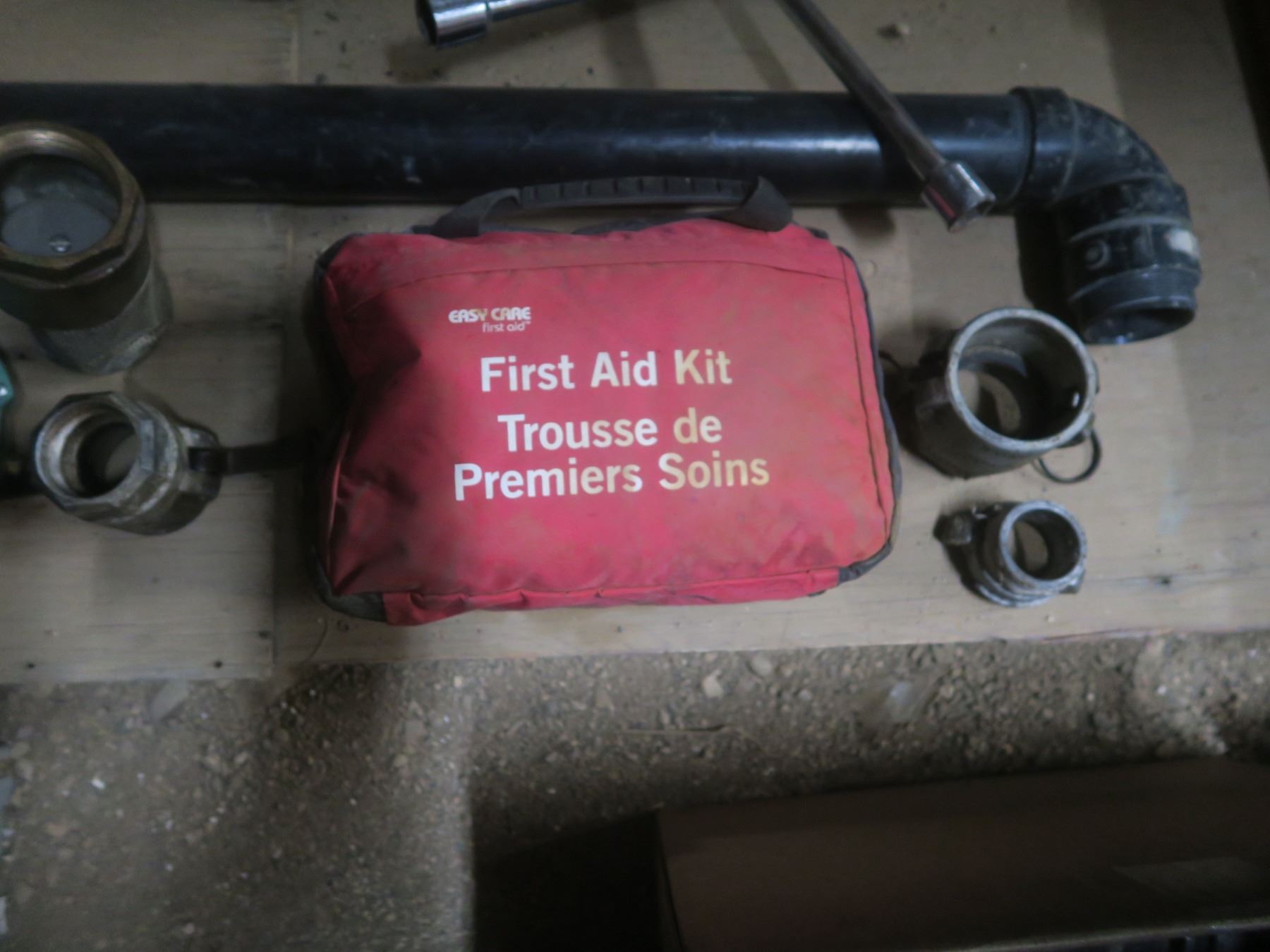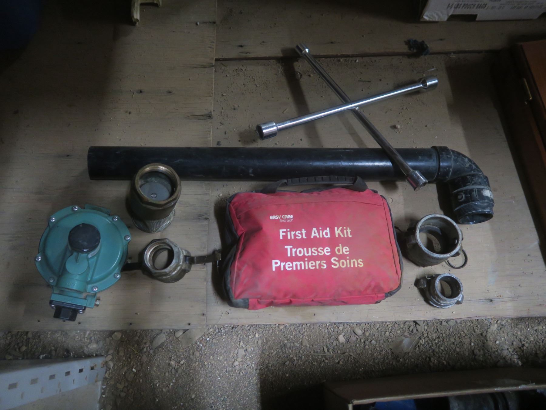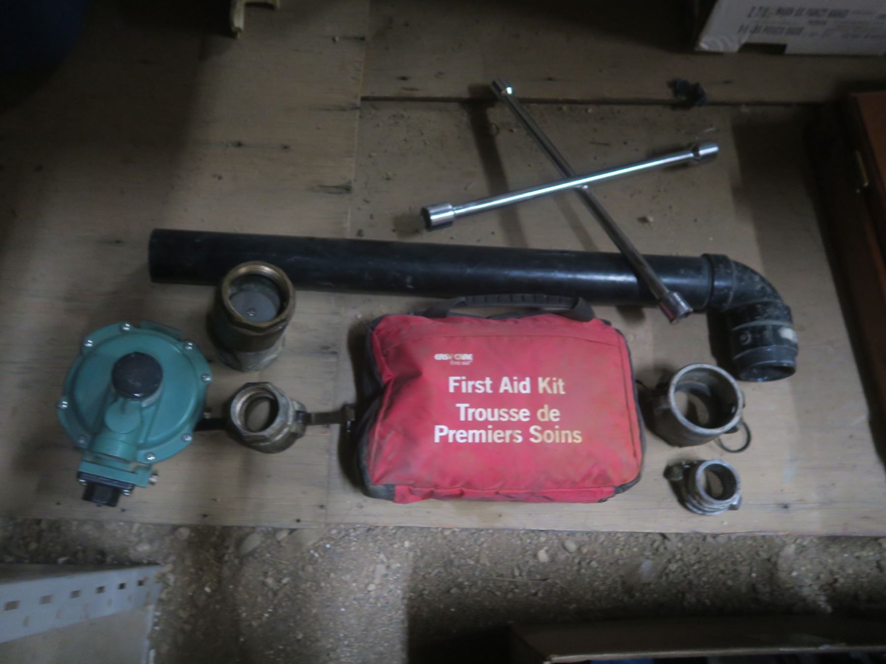 tire iron, first aid kit and hoses