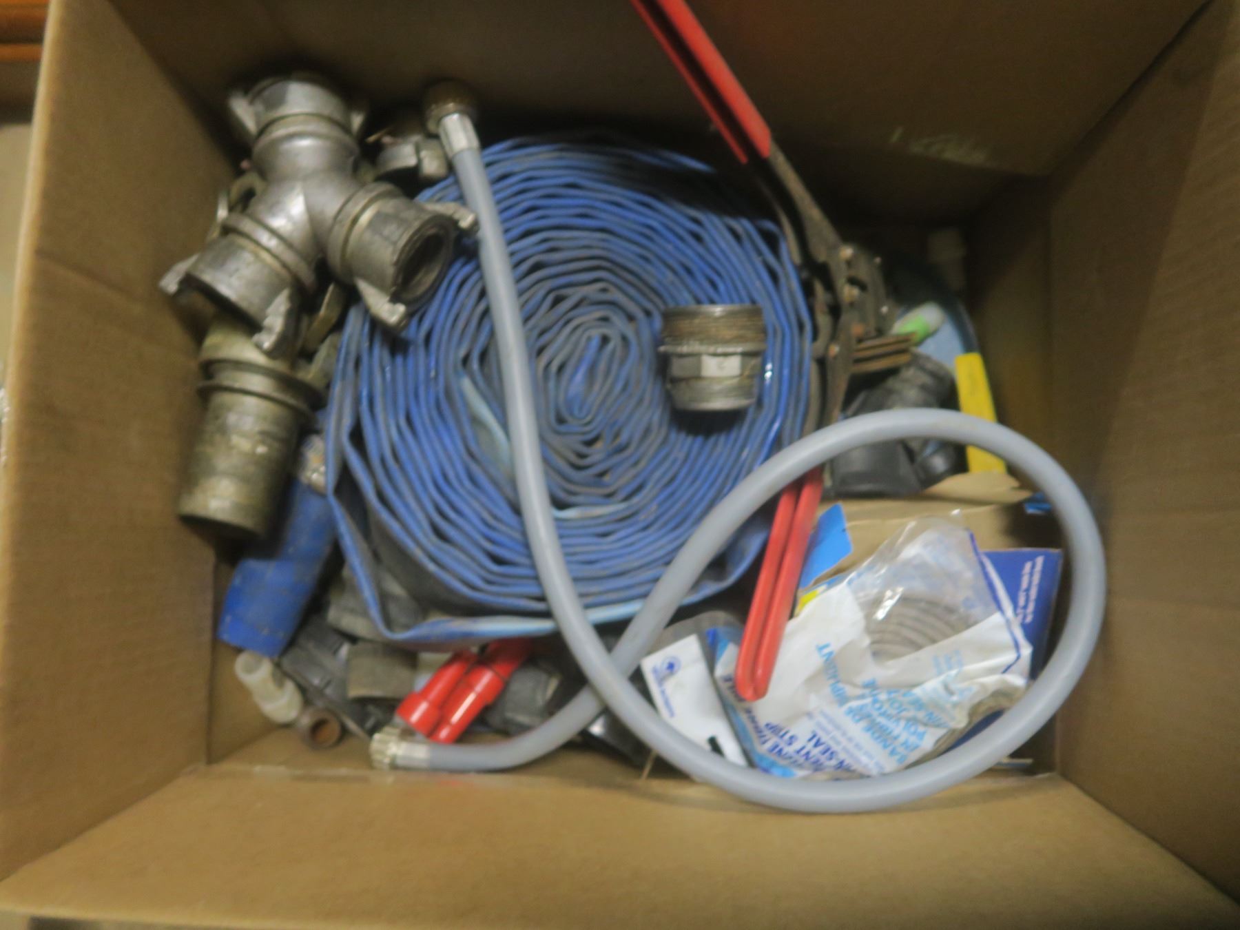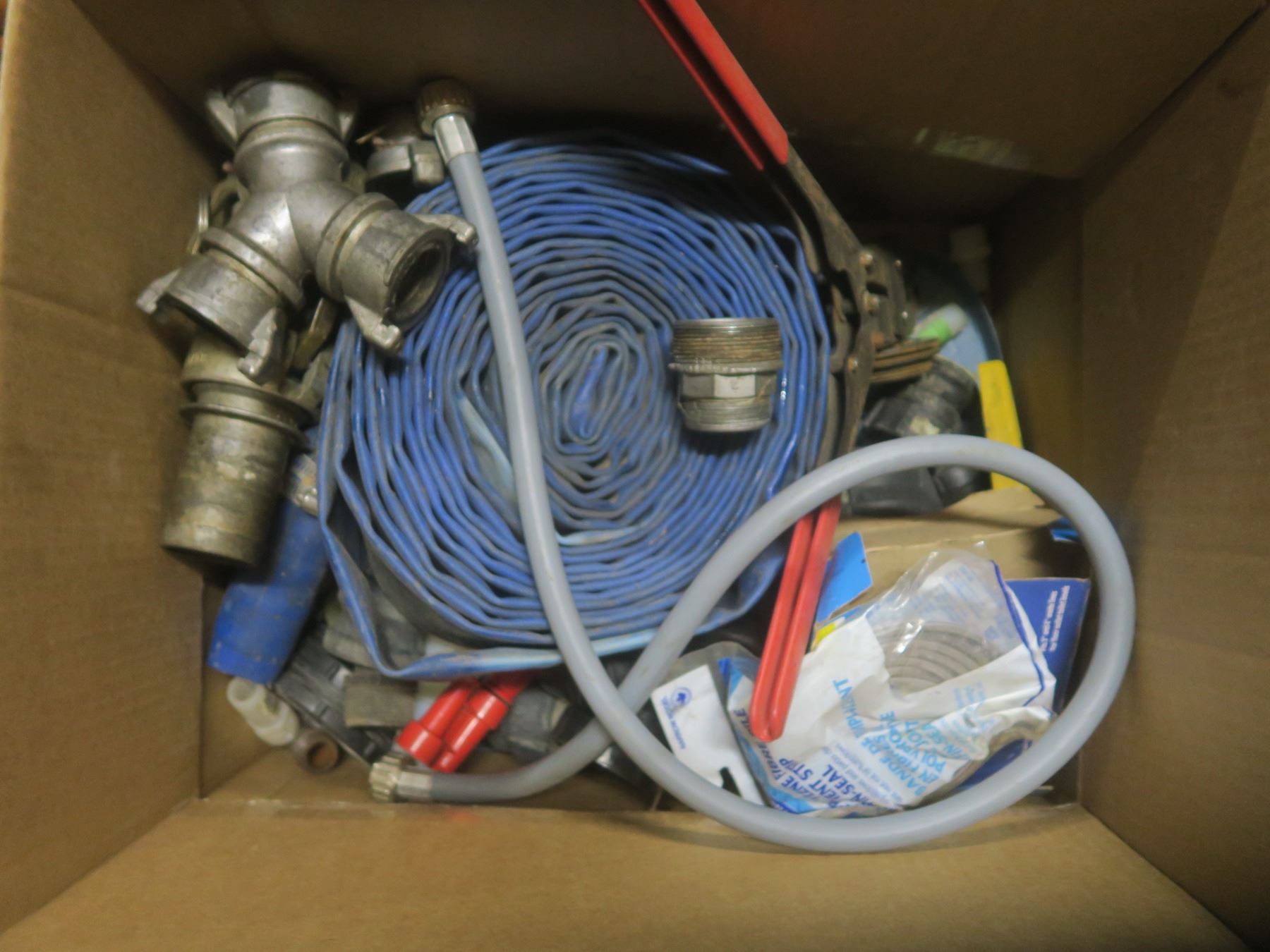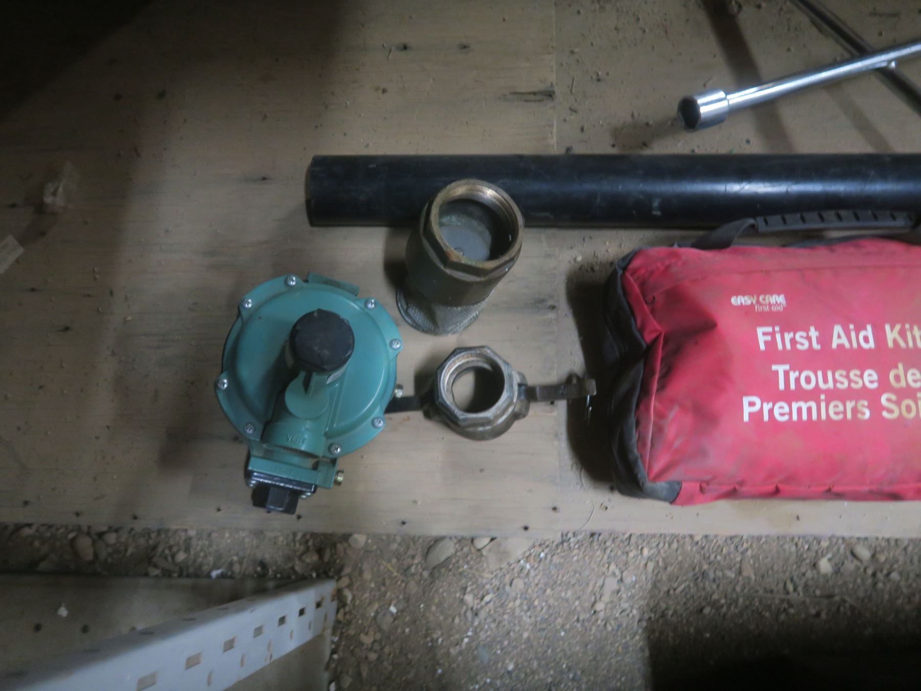 tire iron, first aid kit and hoses
