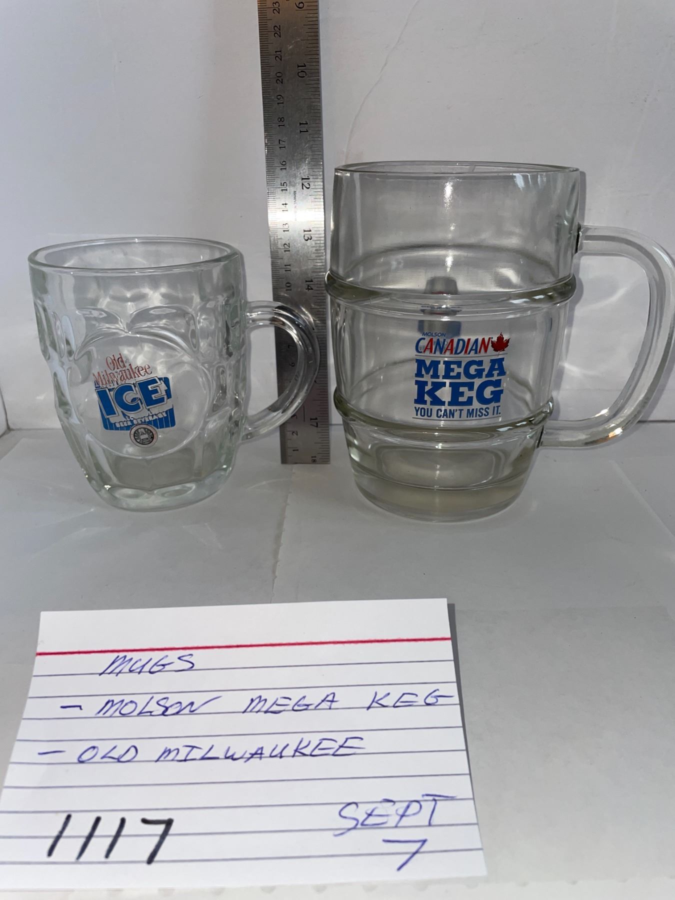 two beer mugs "Molson mega keg, Old Milwaukee"