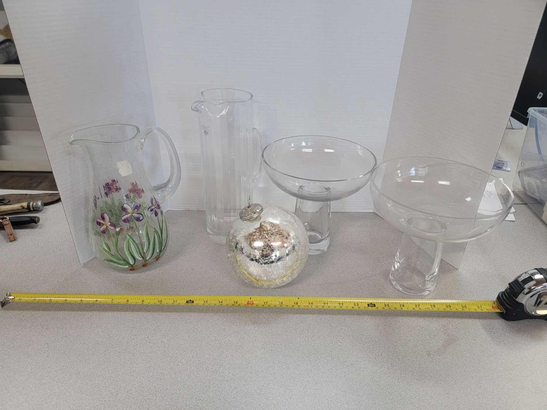 two glass vases, 2 glass bowls, 1 glass xmas ornament