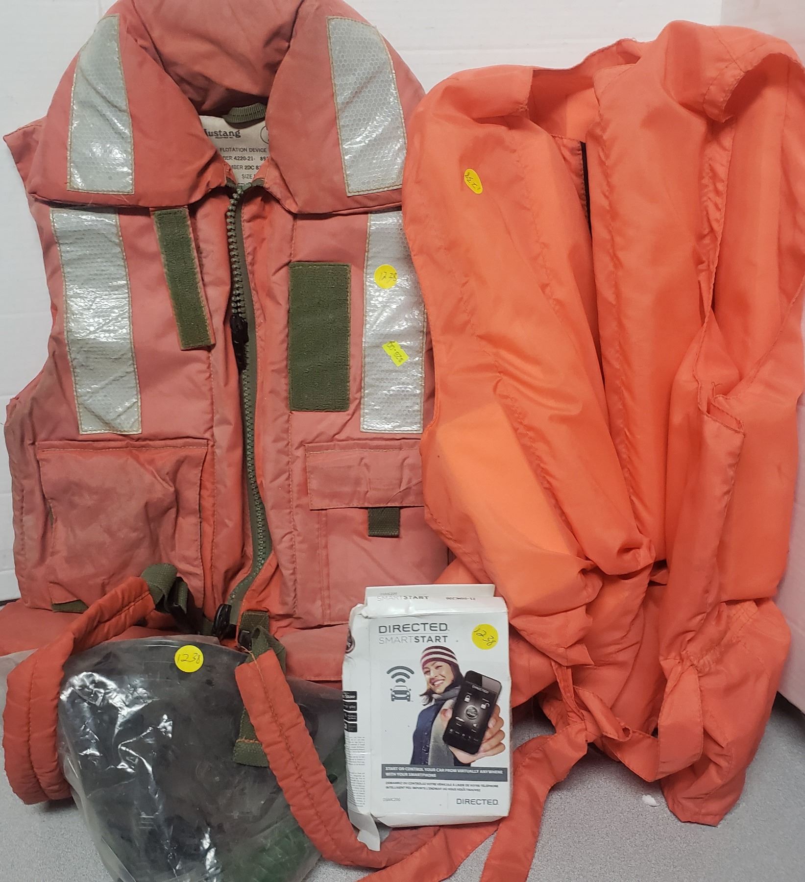 two life jacket vests command start , funnels wooden matches