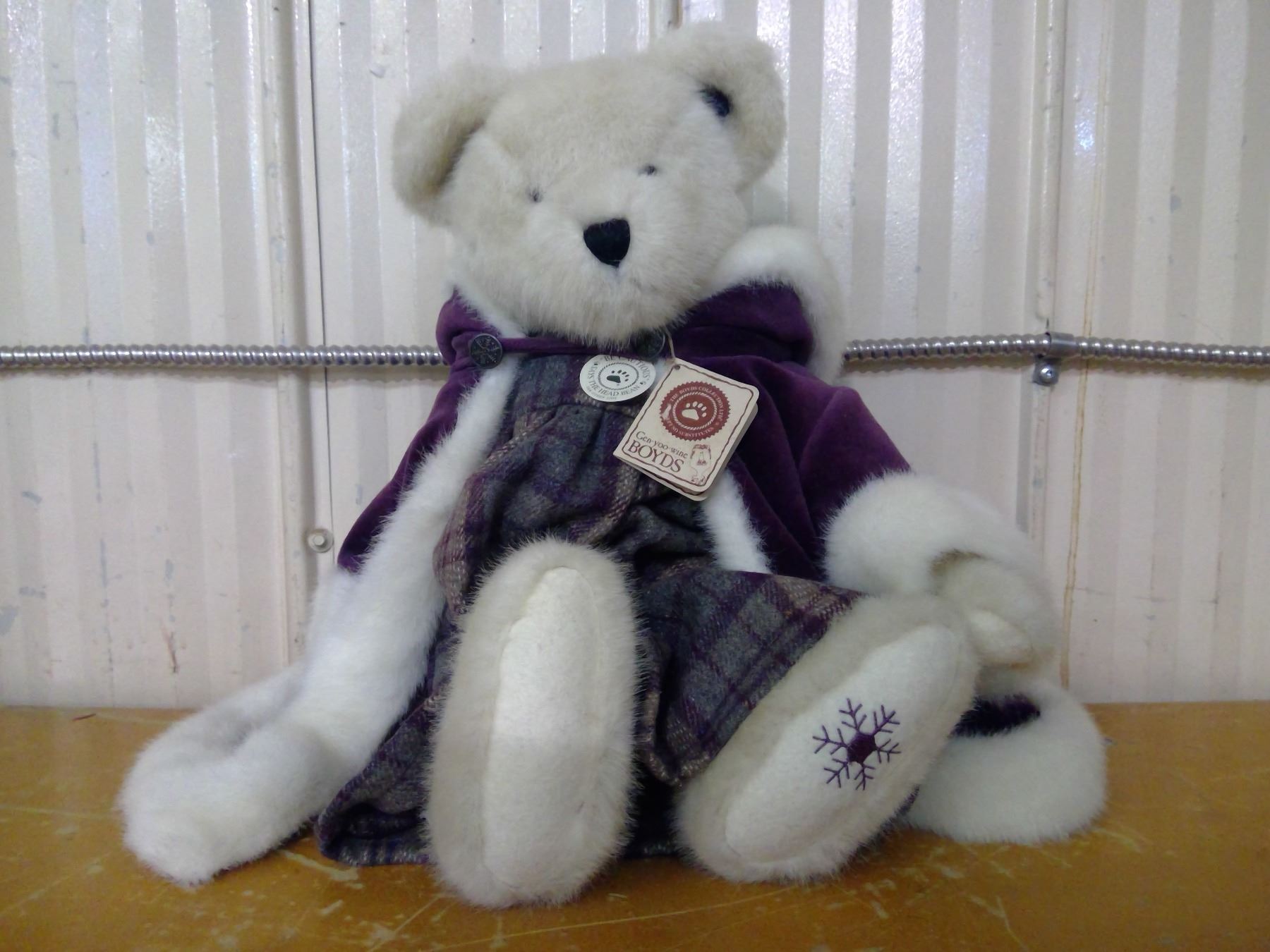 two mary kay bears, one coca cola bear, and one winter teddy bear