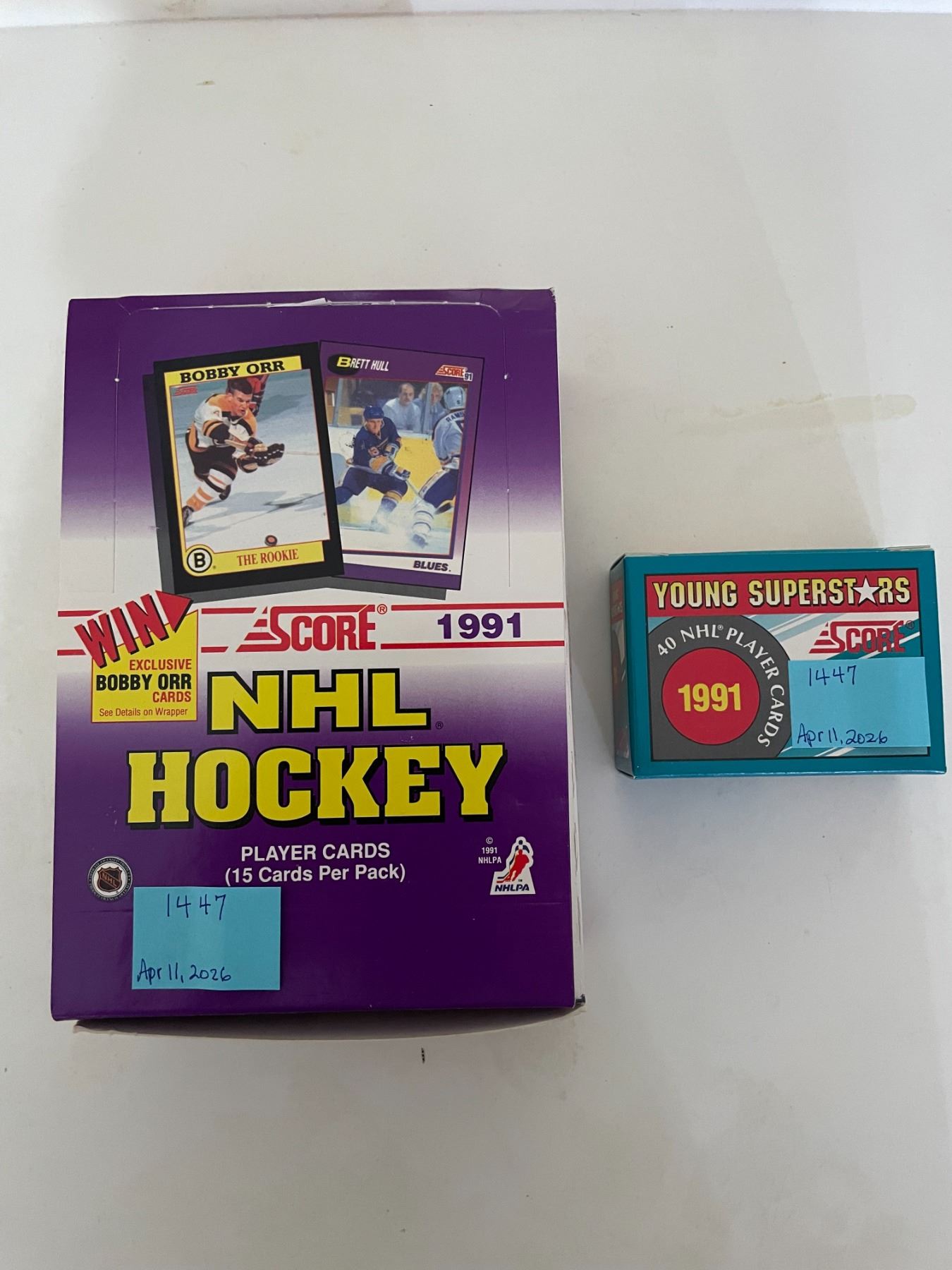 unopened 1991 score hockey cards box and 1991 score box of young superstars hockey cards