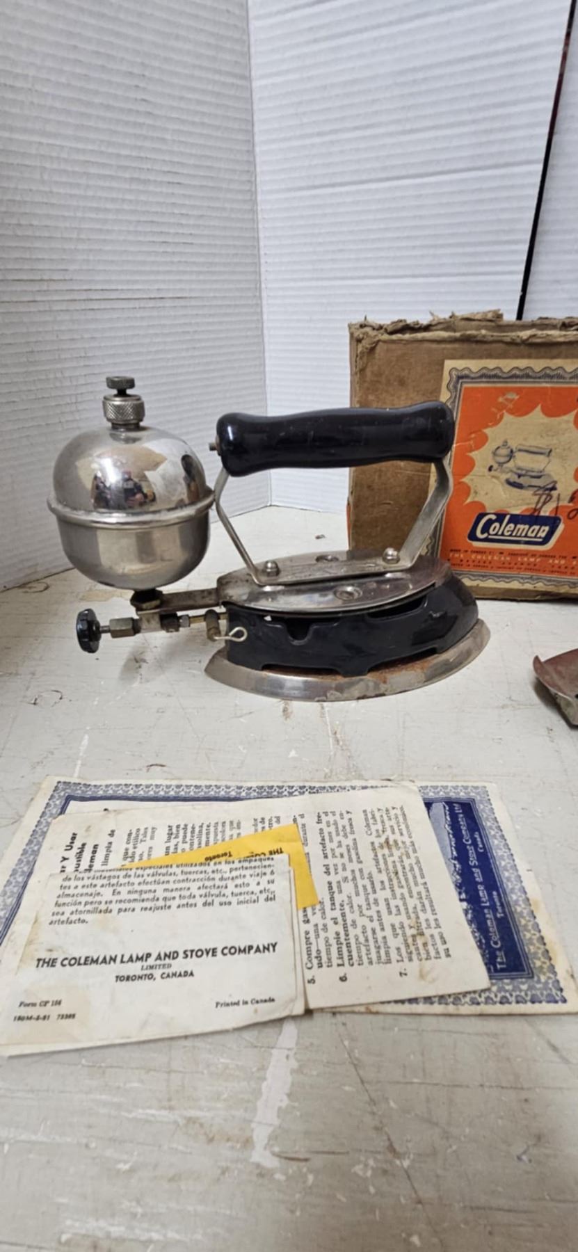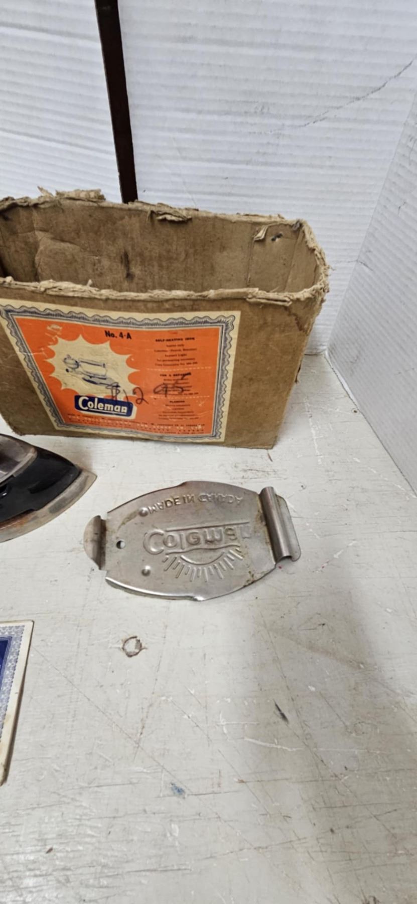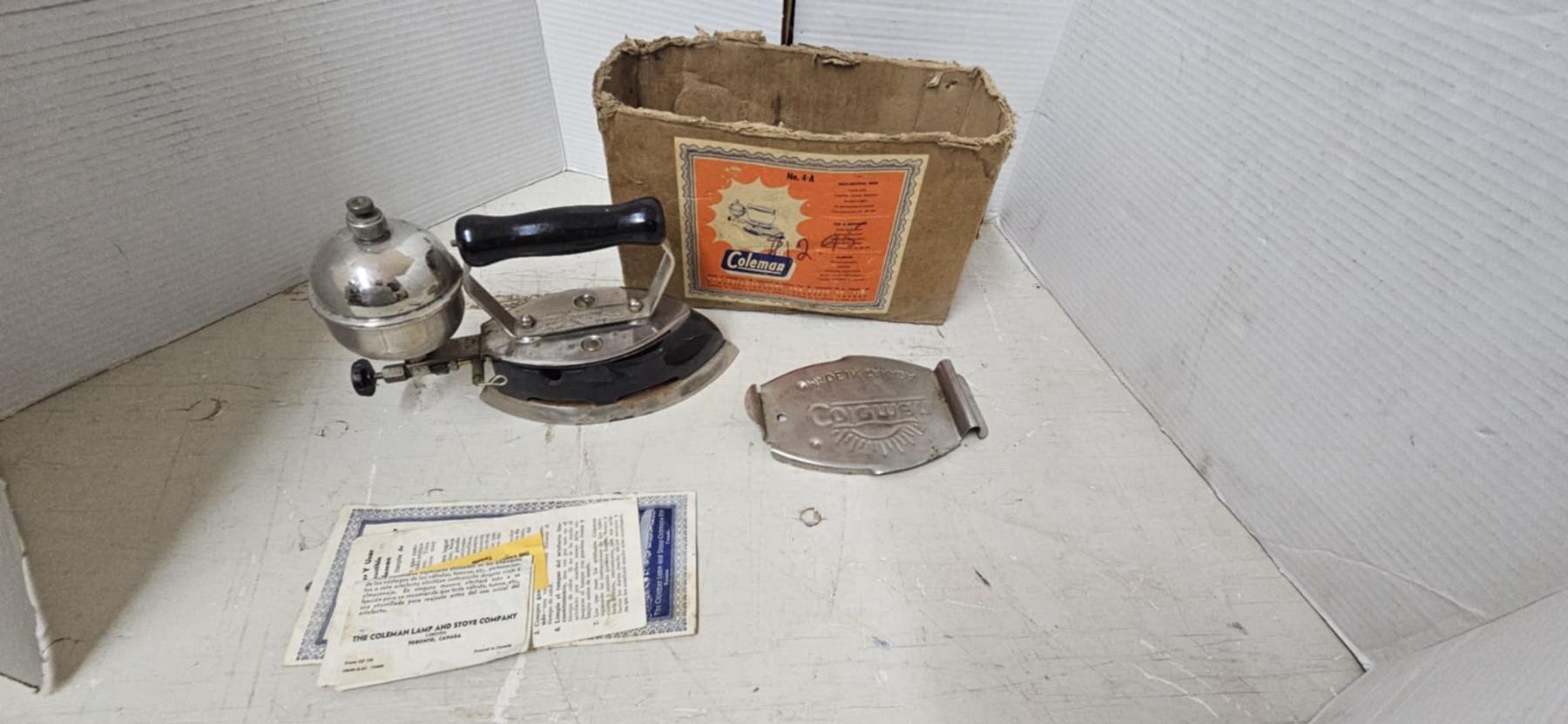 vintage 1940's Coleman 4-A iron w/ box plus manual trivet