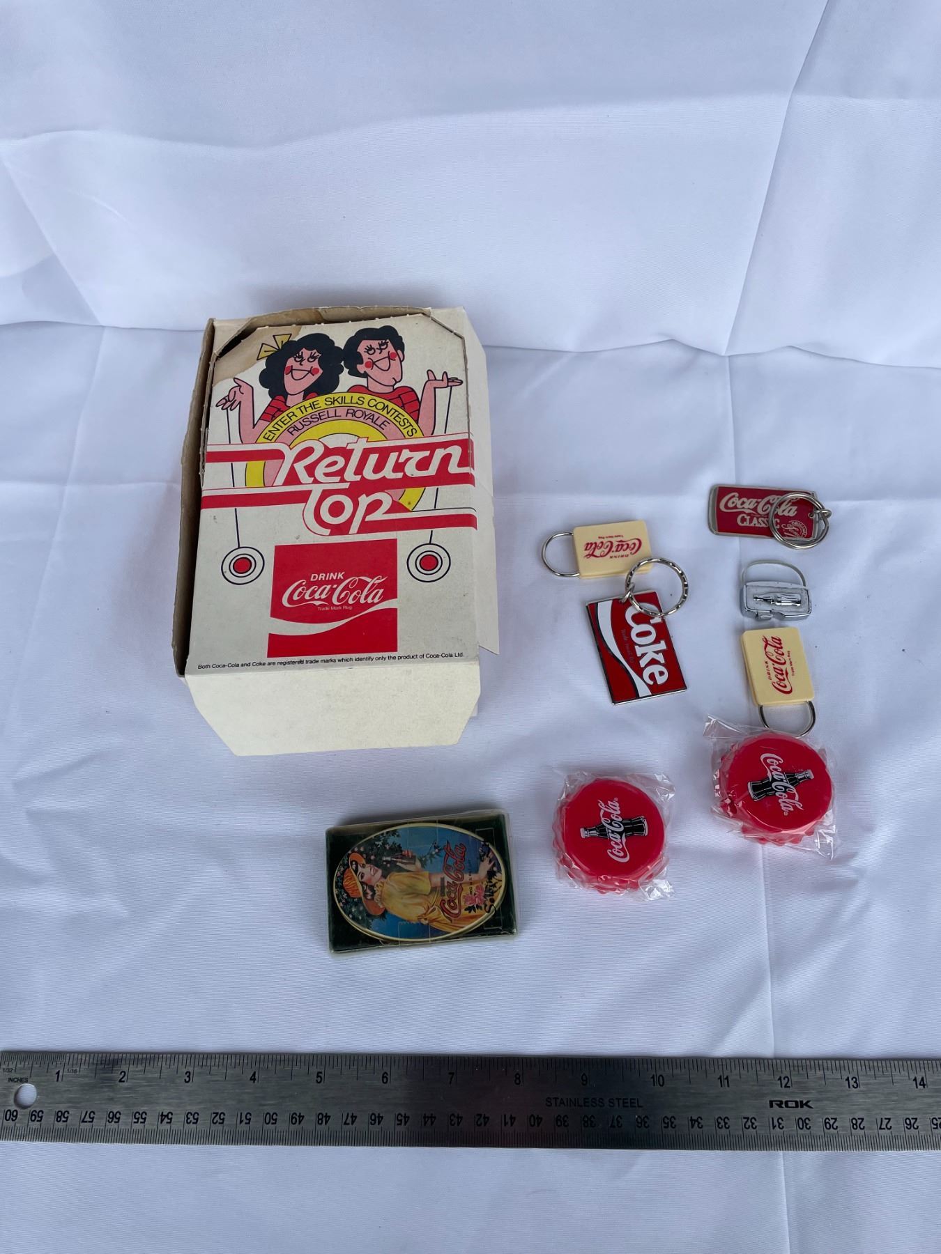 vintage Coca-Cola key chains, sewing kit + empty yo-yo box