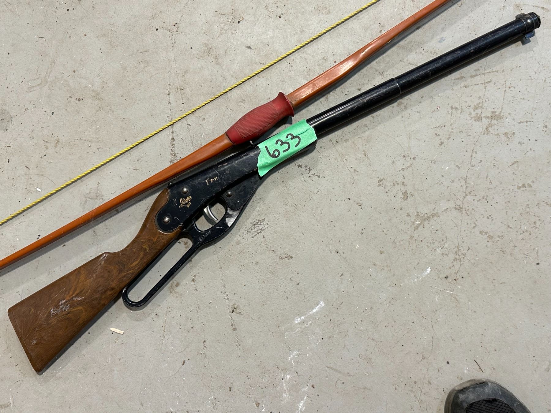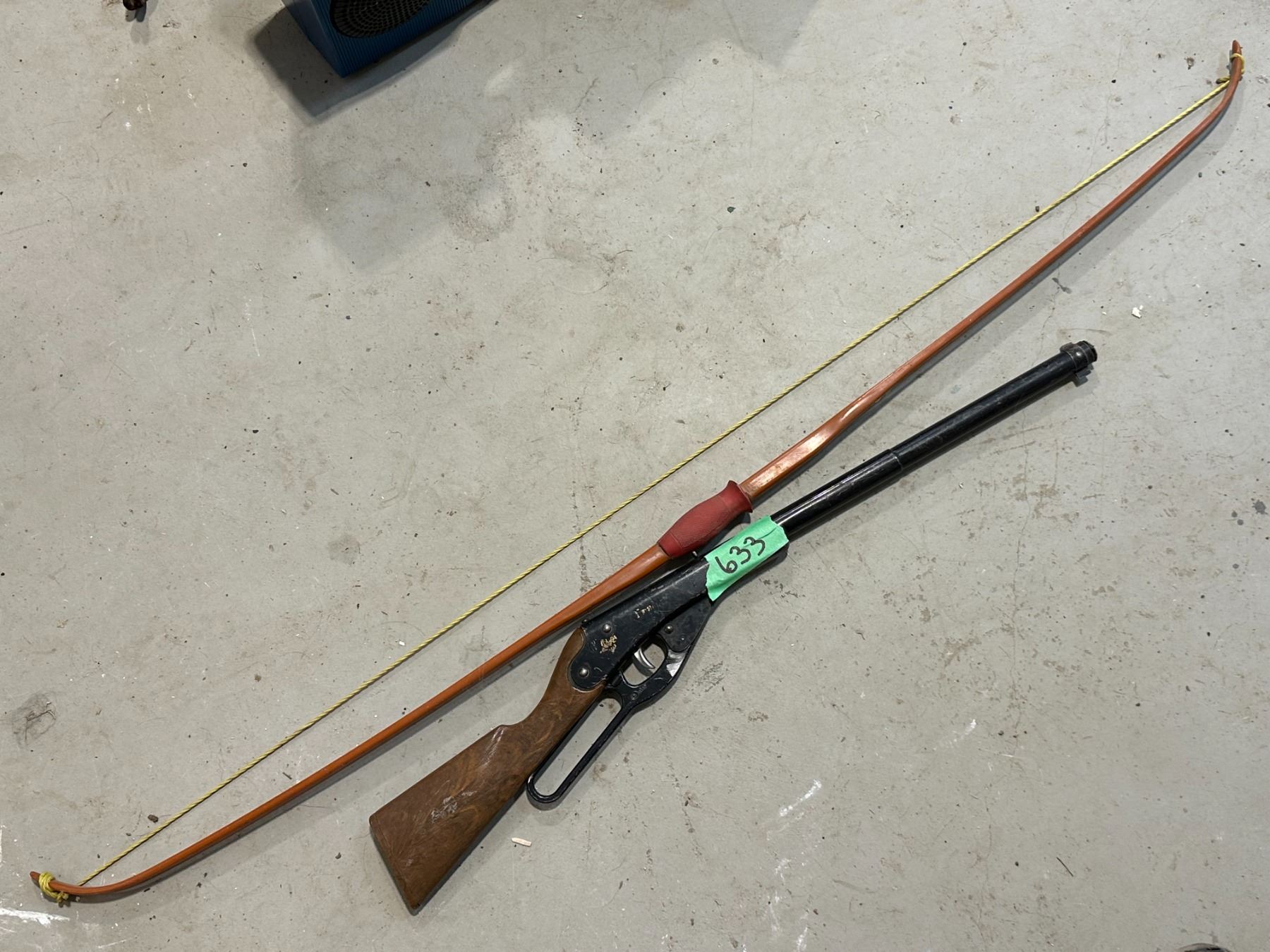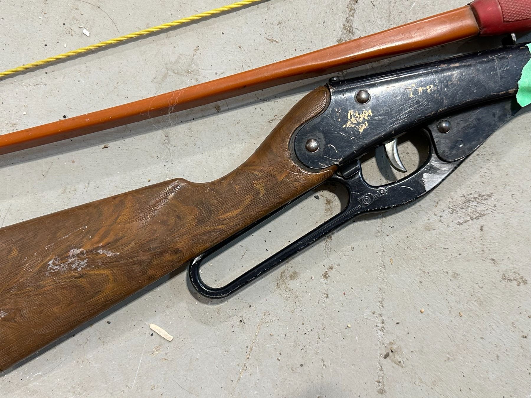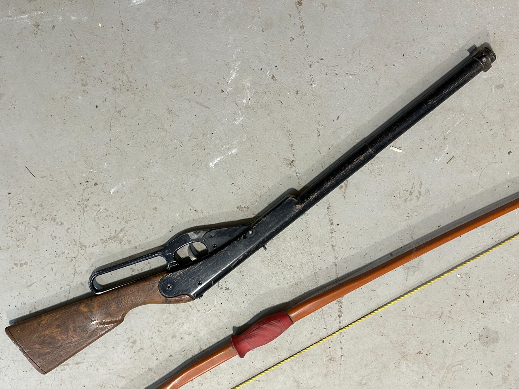 vintage Daisy toy rifle, loads, barrel plugged + Dunarco bow, made in Canada, #70 Wt-35