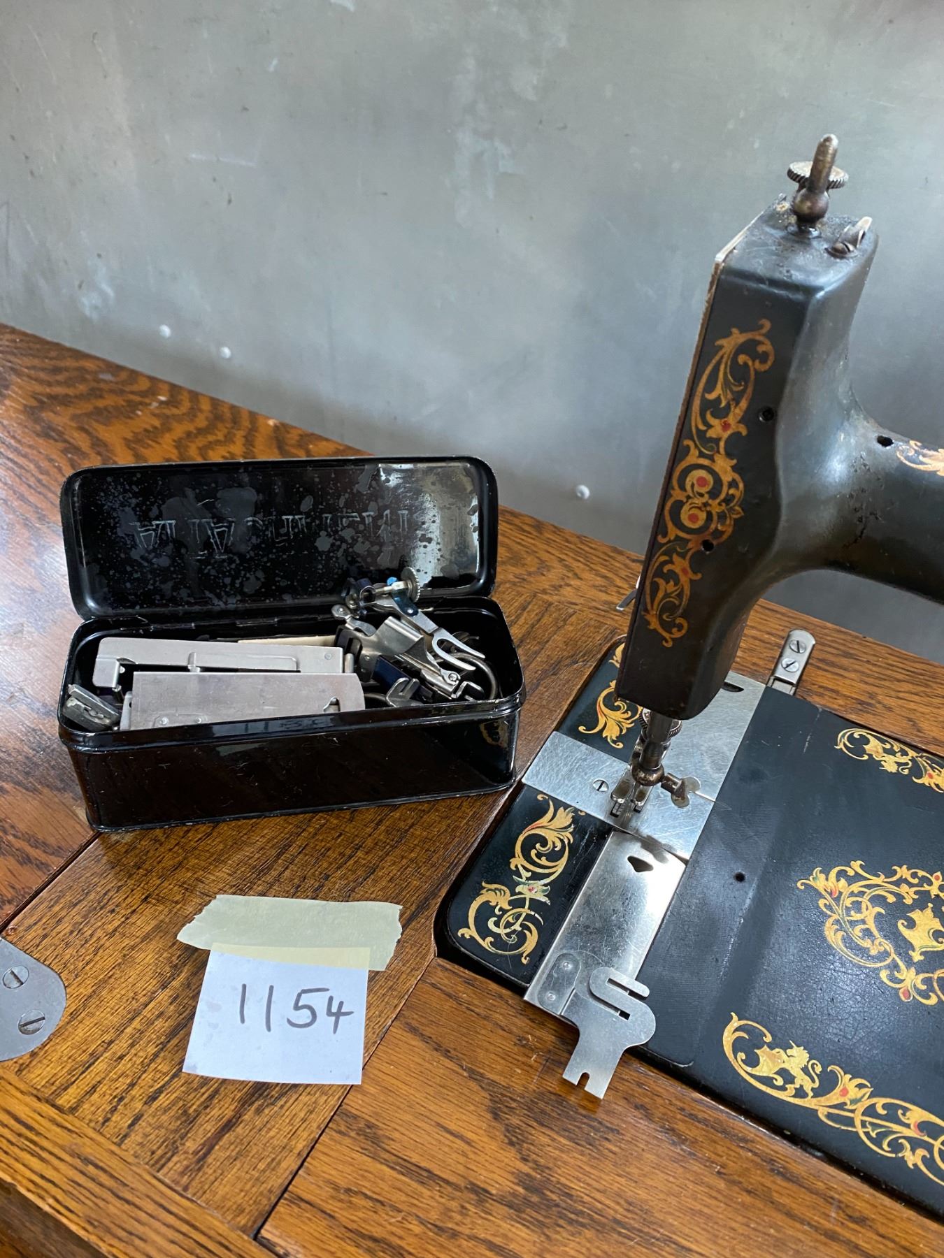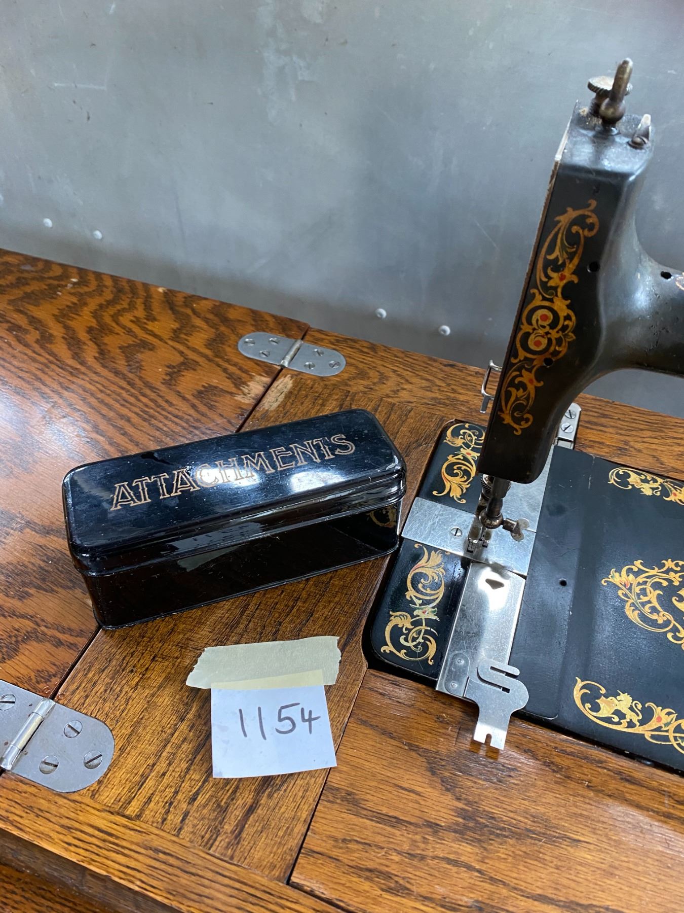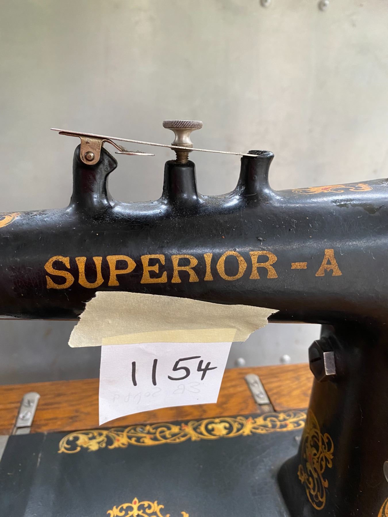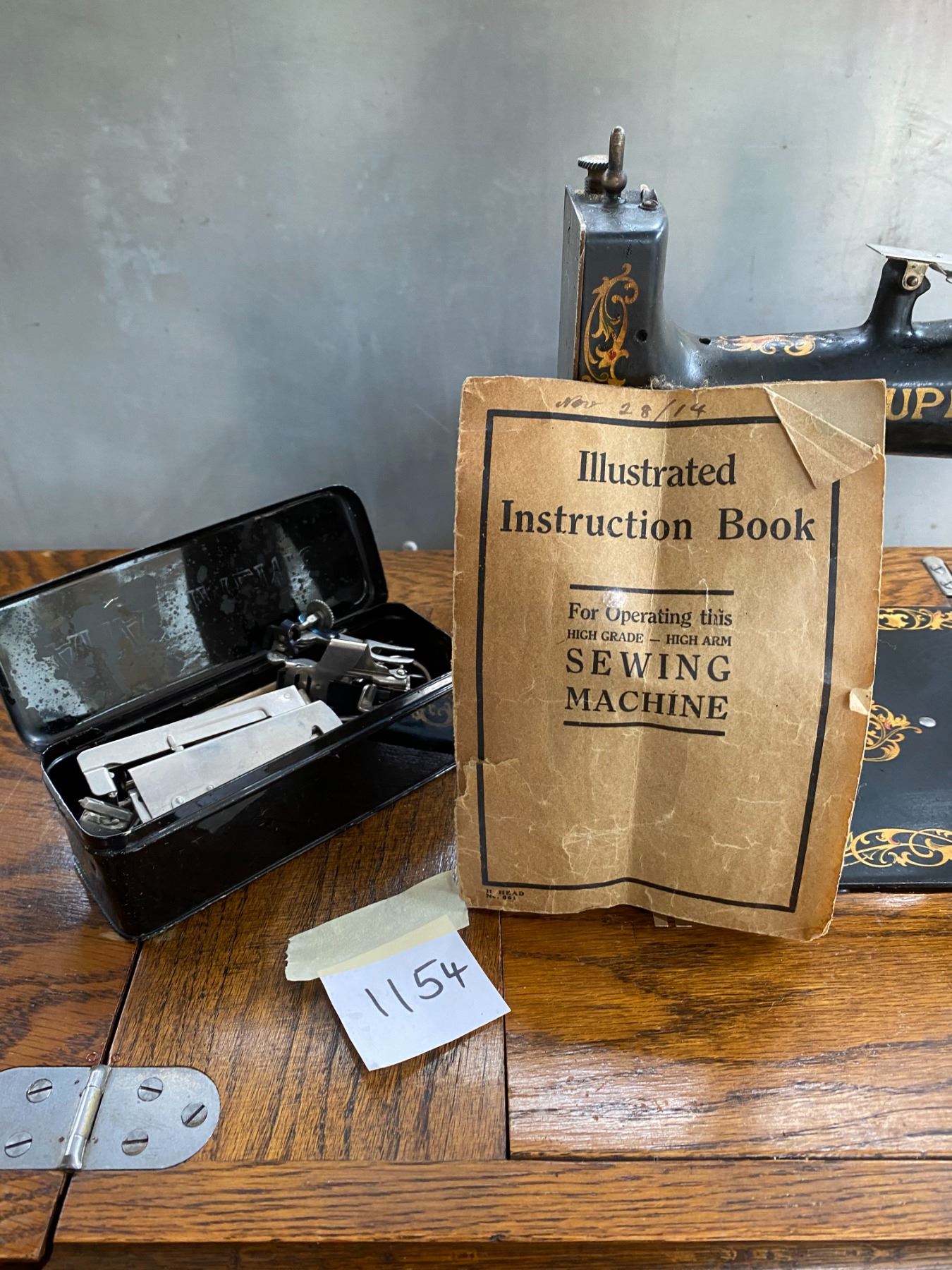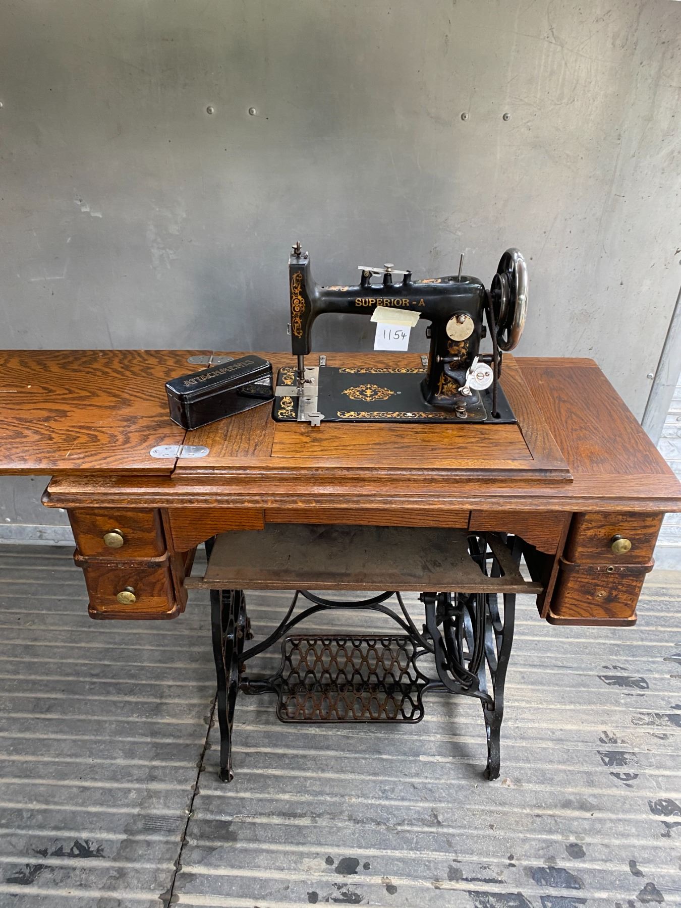 vintage Superior-A tredle sewing machine, solid oak cabinet, cast base, nice graphics, original attachments in case & instruction manual