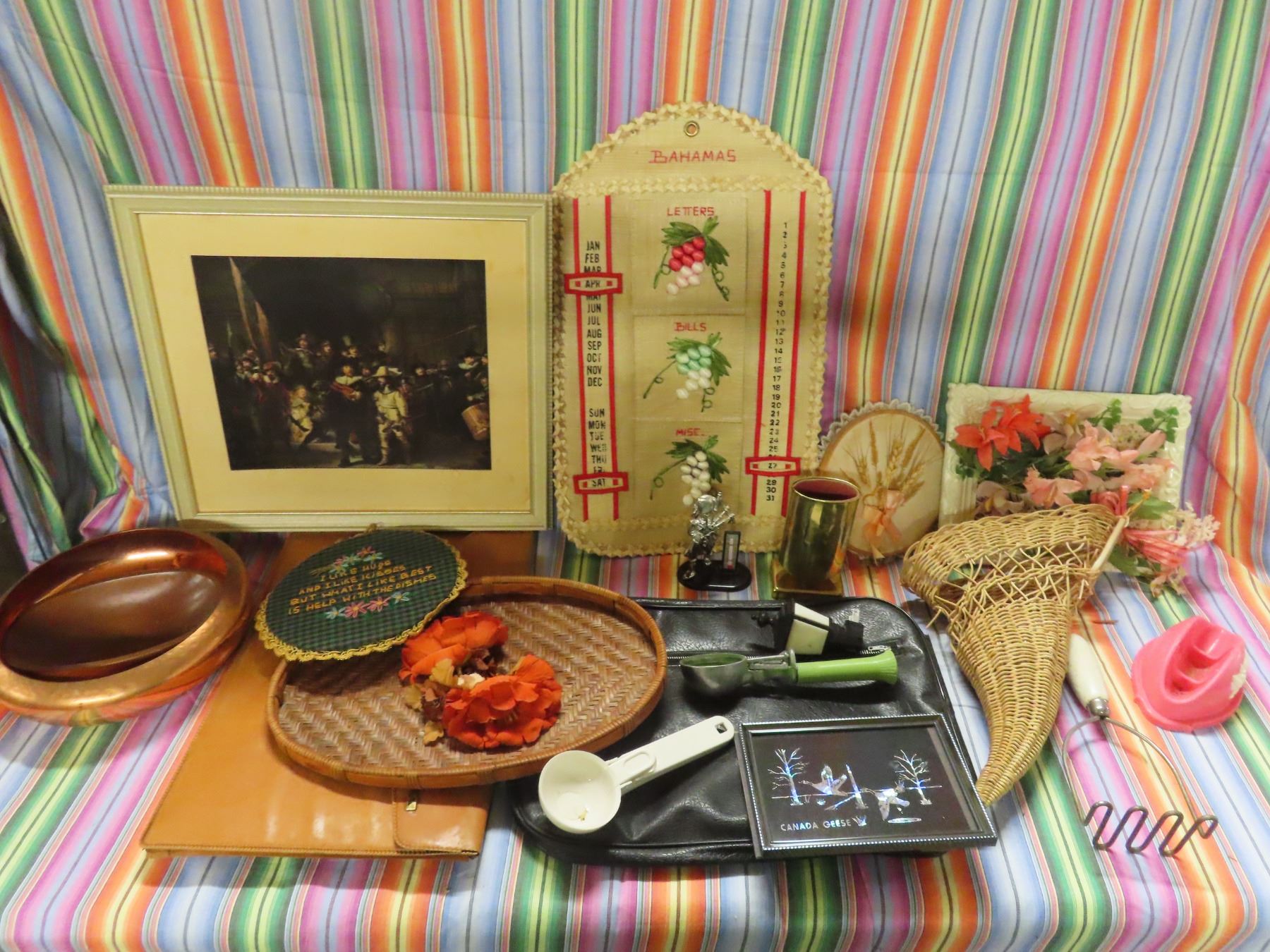 vintage décor , brass bowl , frame antique picture , calendar , ice cream scoops