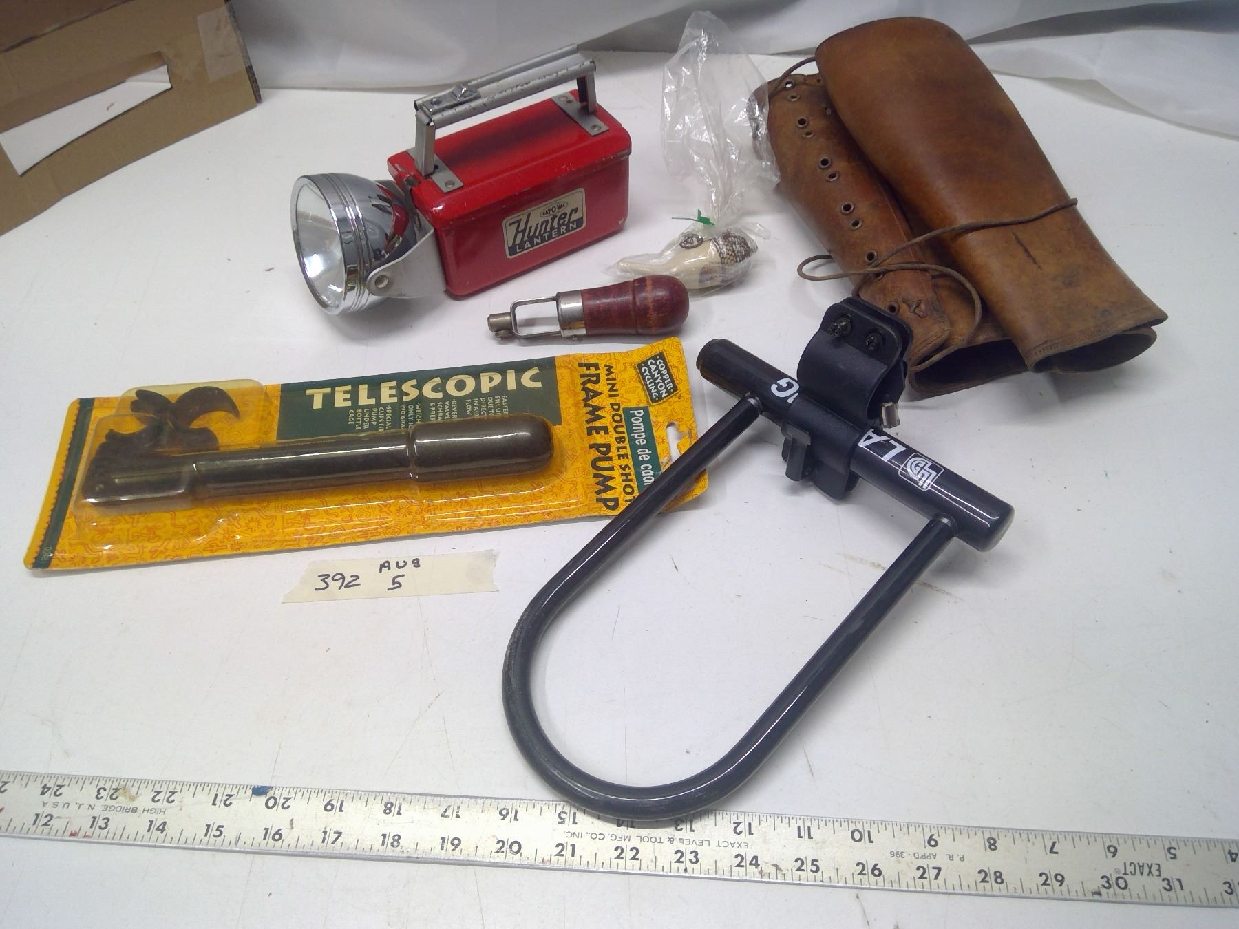 vintage flashlight, leather guards, bike lock with key, bike pump, etc.