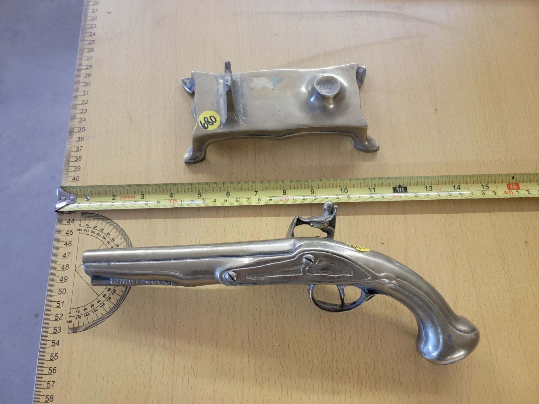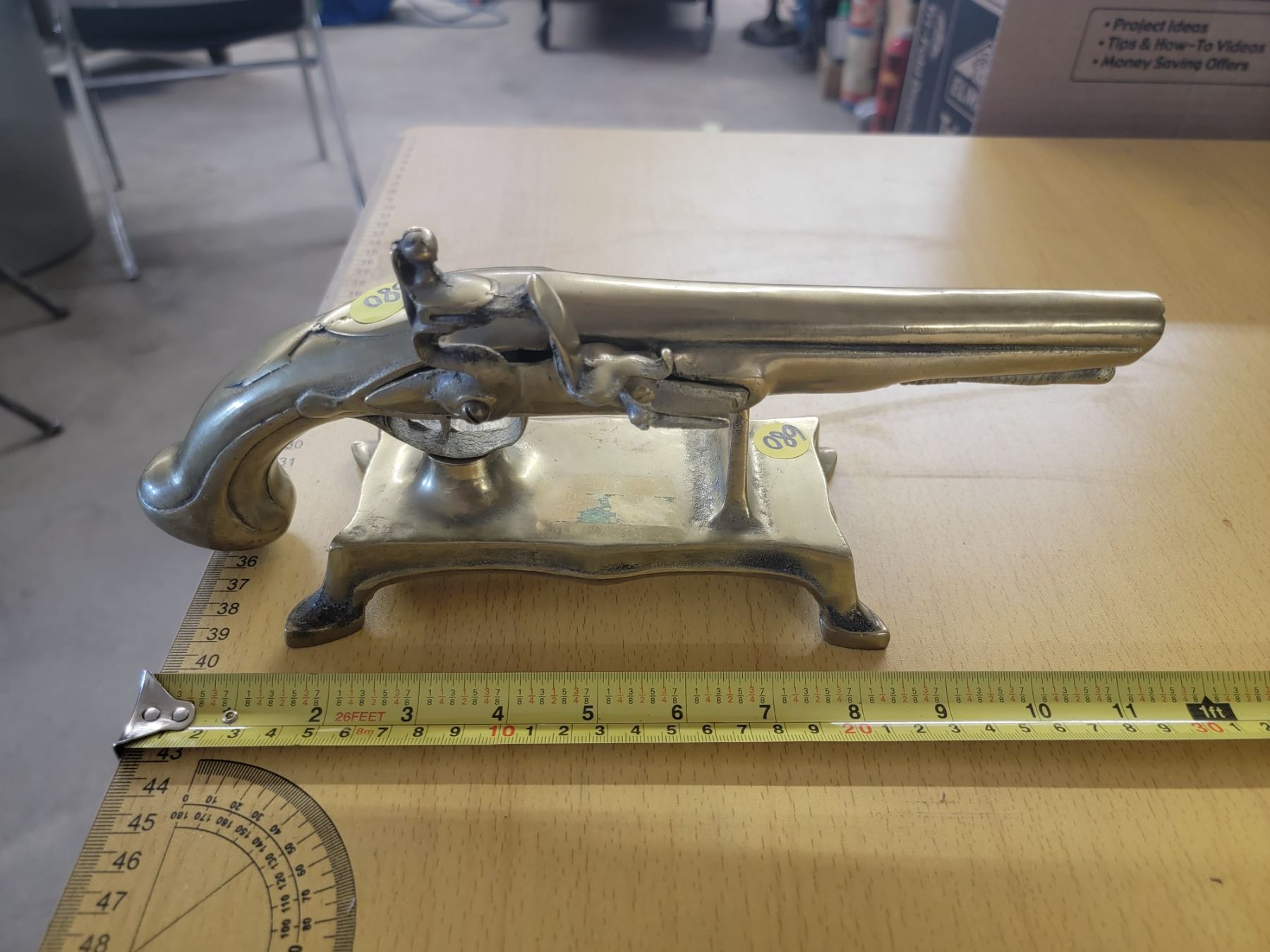 vintage heavy brass flintlock pistol on stand 12" - decorative