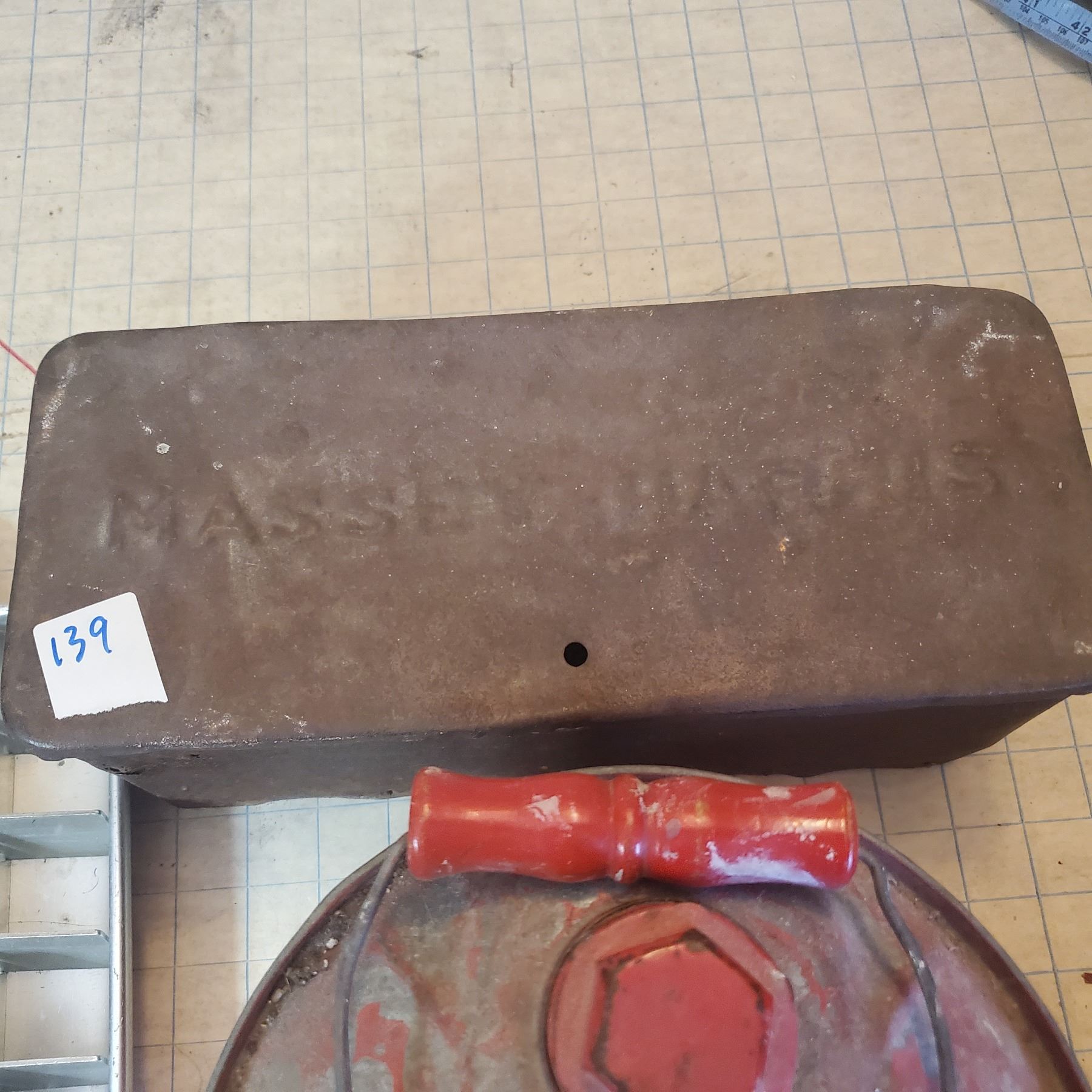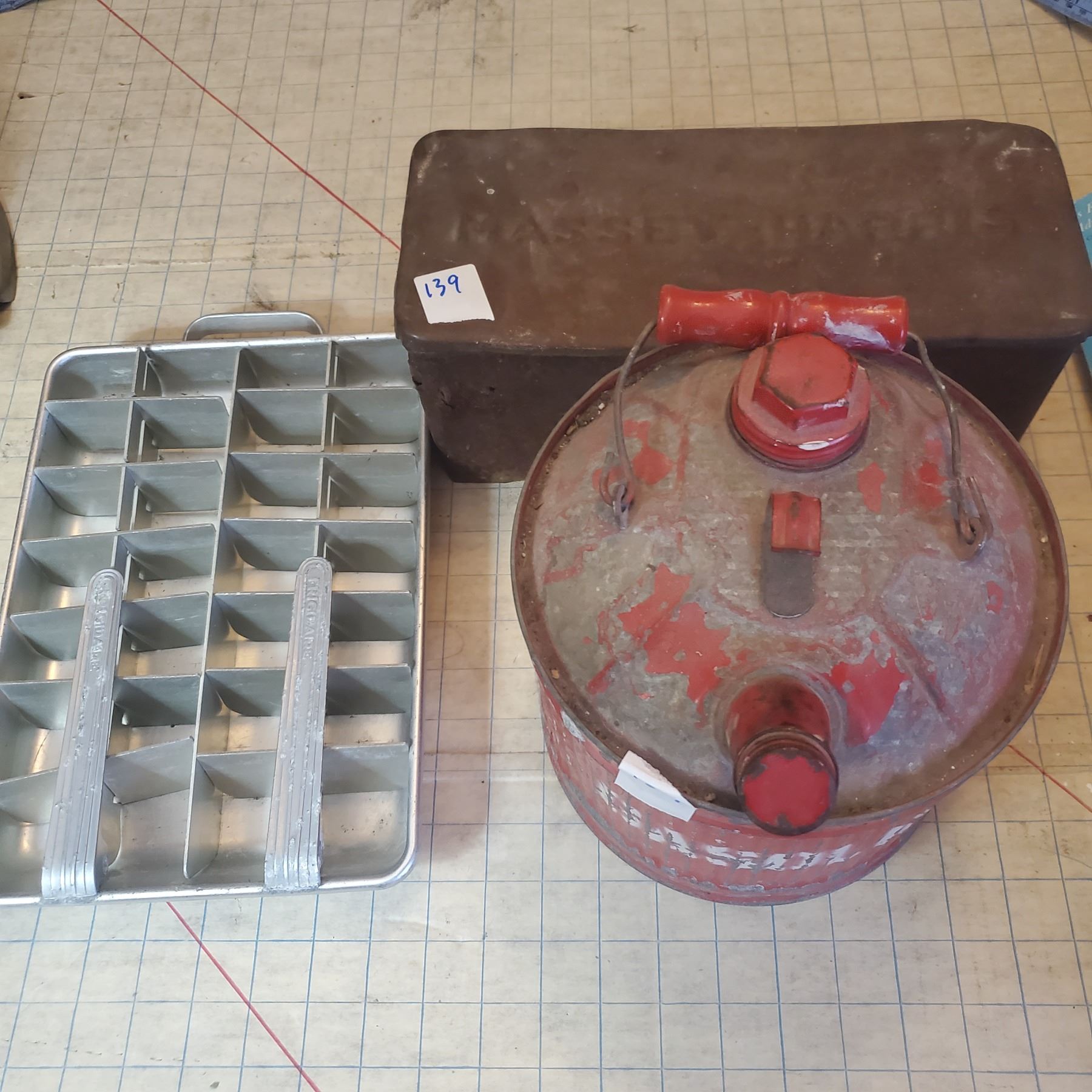 vintage lot of House Decor Massey Harris Tool Box, Gasoline Can, large double wide aluminium Frigidaire Ice Cube Tray