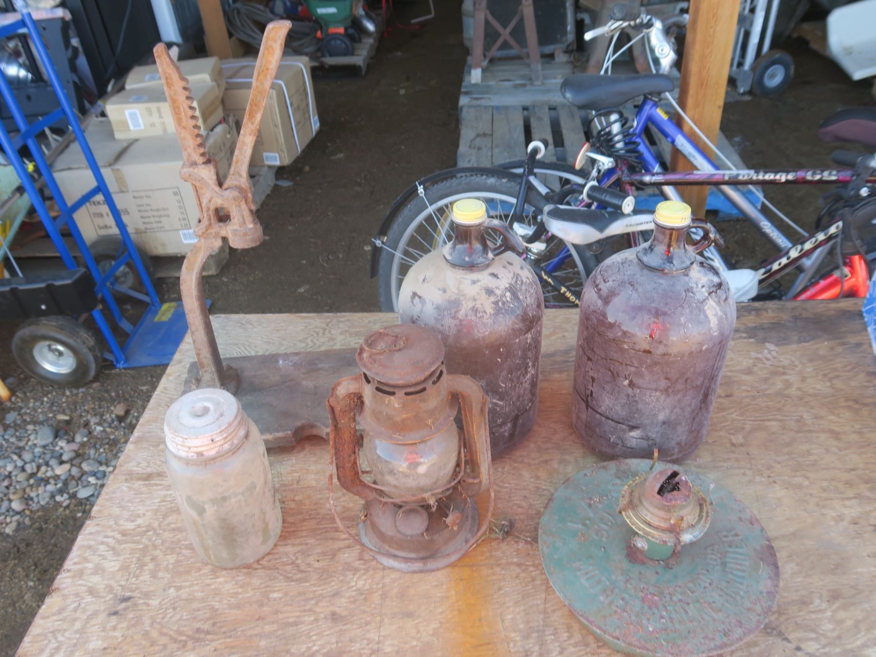 vintage oil lamps, whiskey jugs, jar and bottle capper