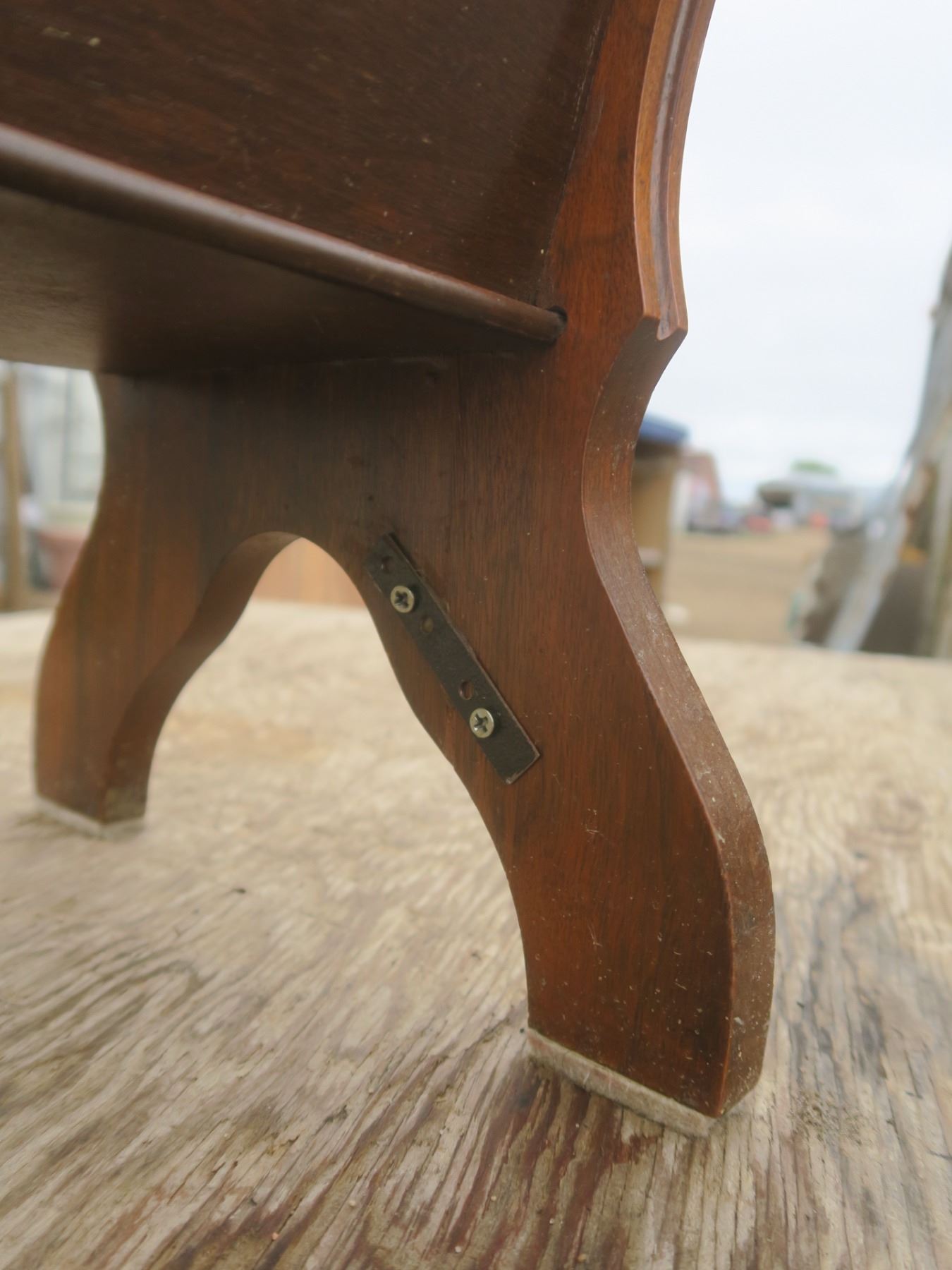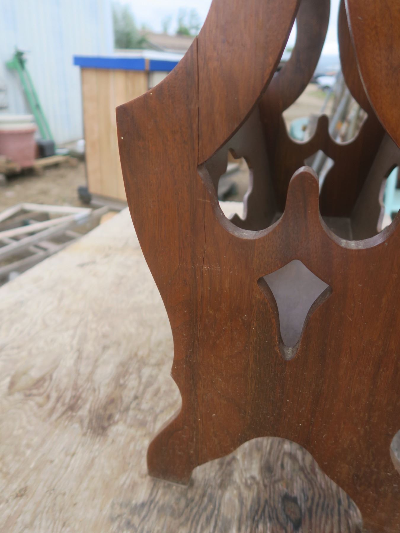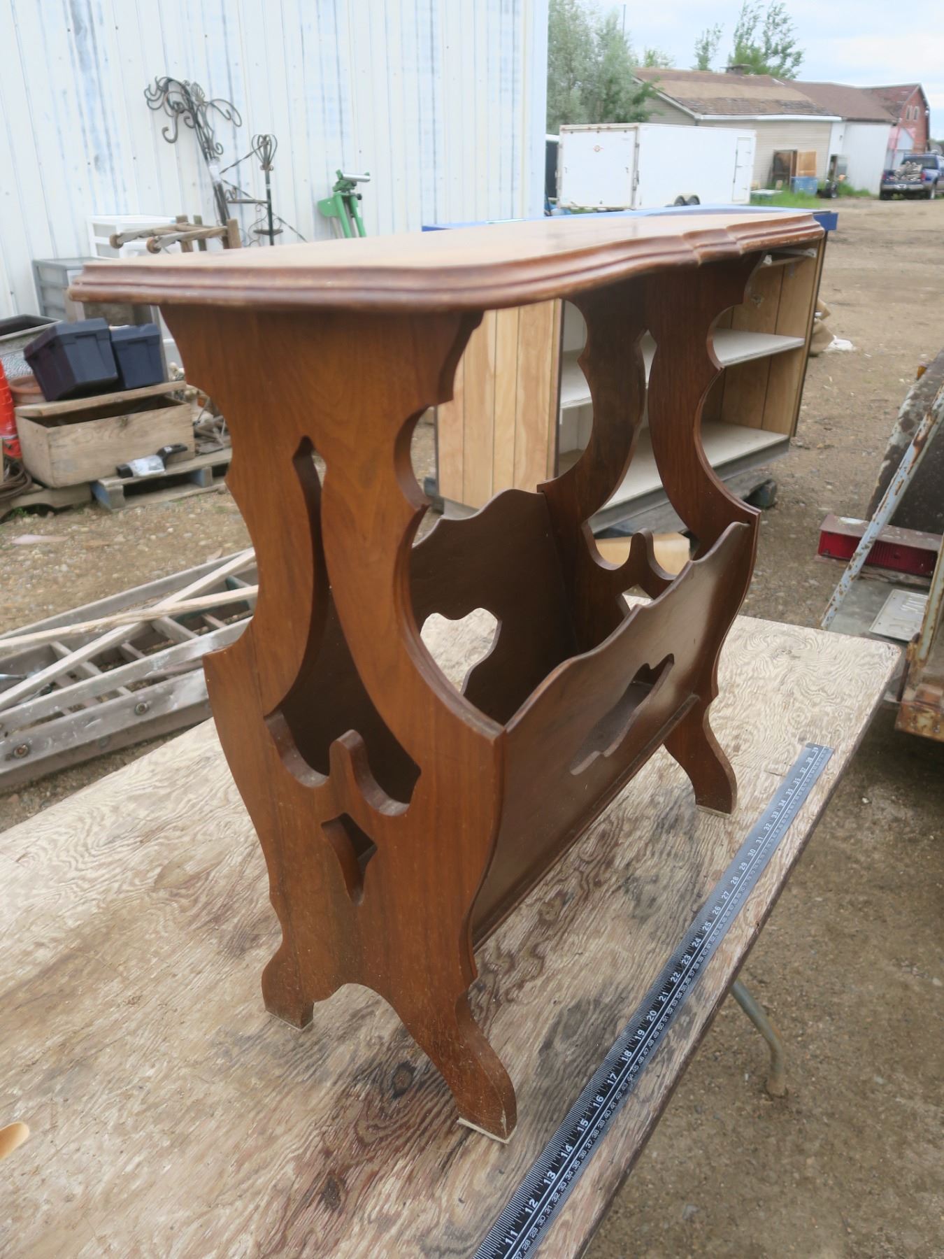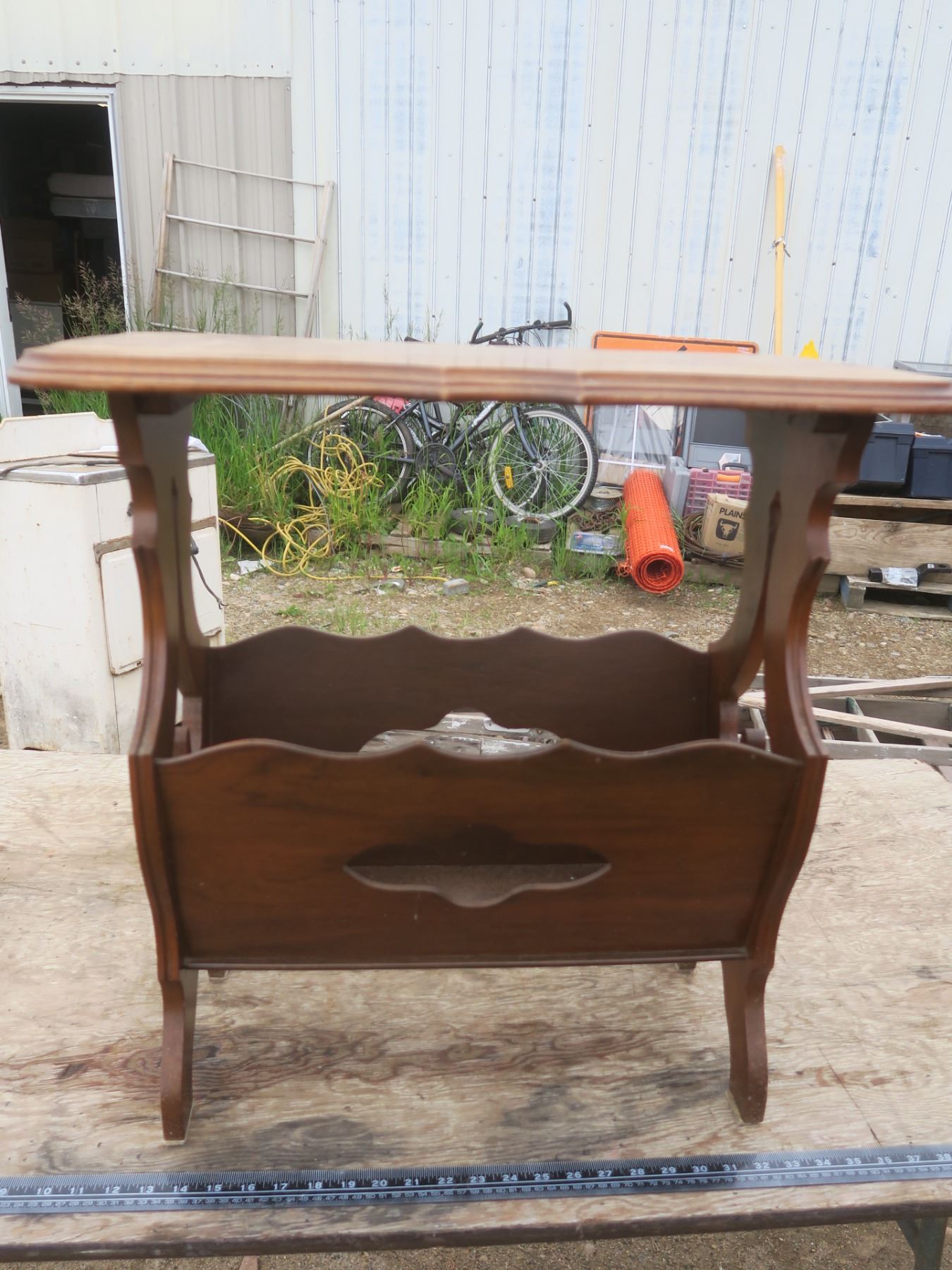 vintage side table/magazine rack - repaired leg, 24"x12"x24"H