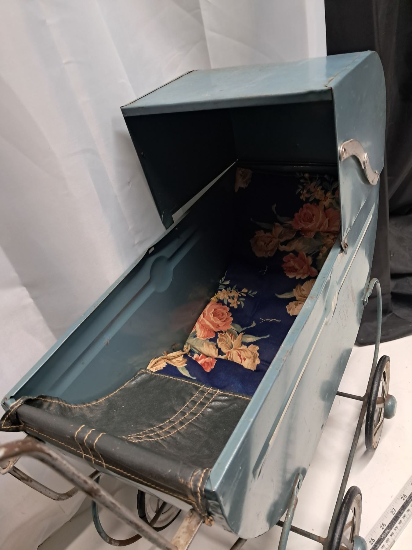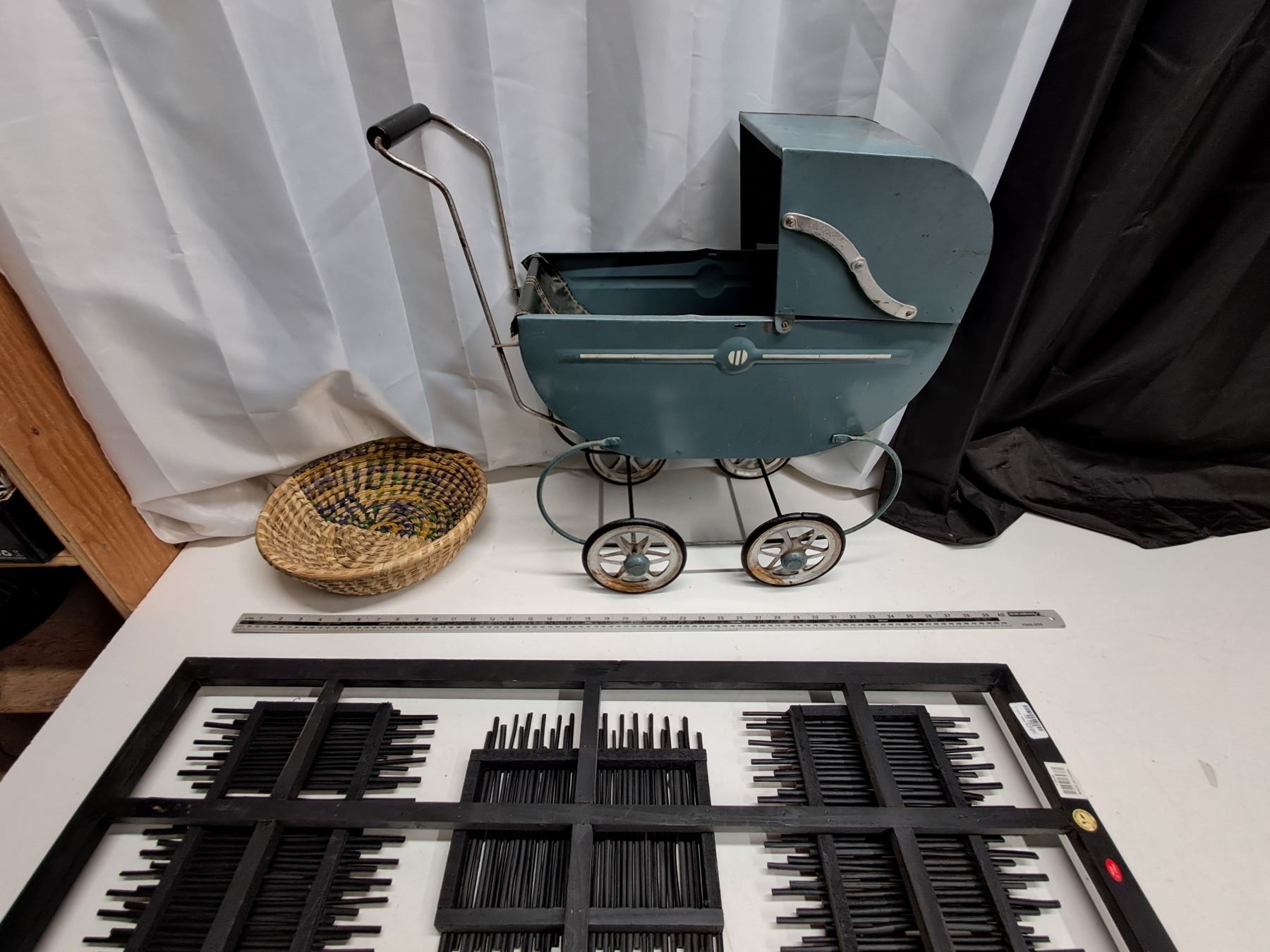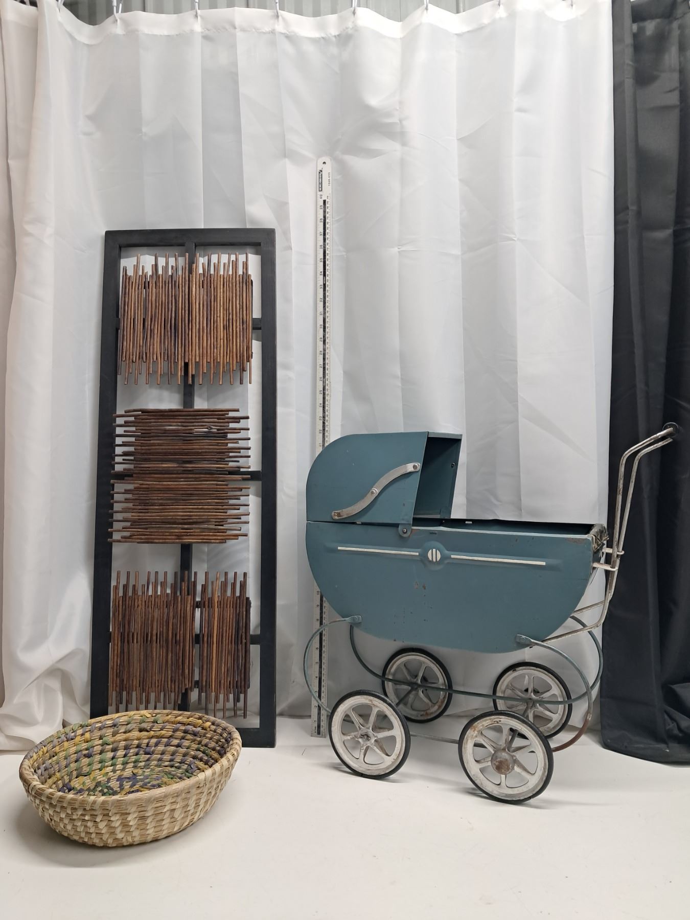 "vintage stroller, basket, décor"