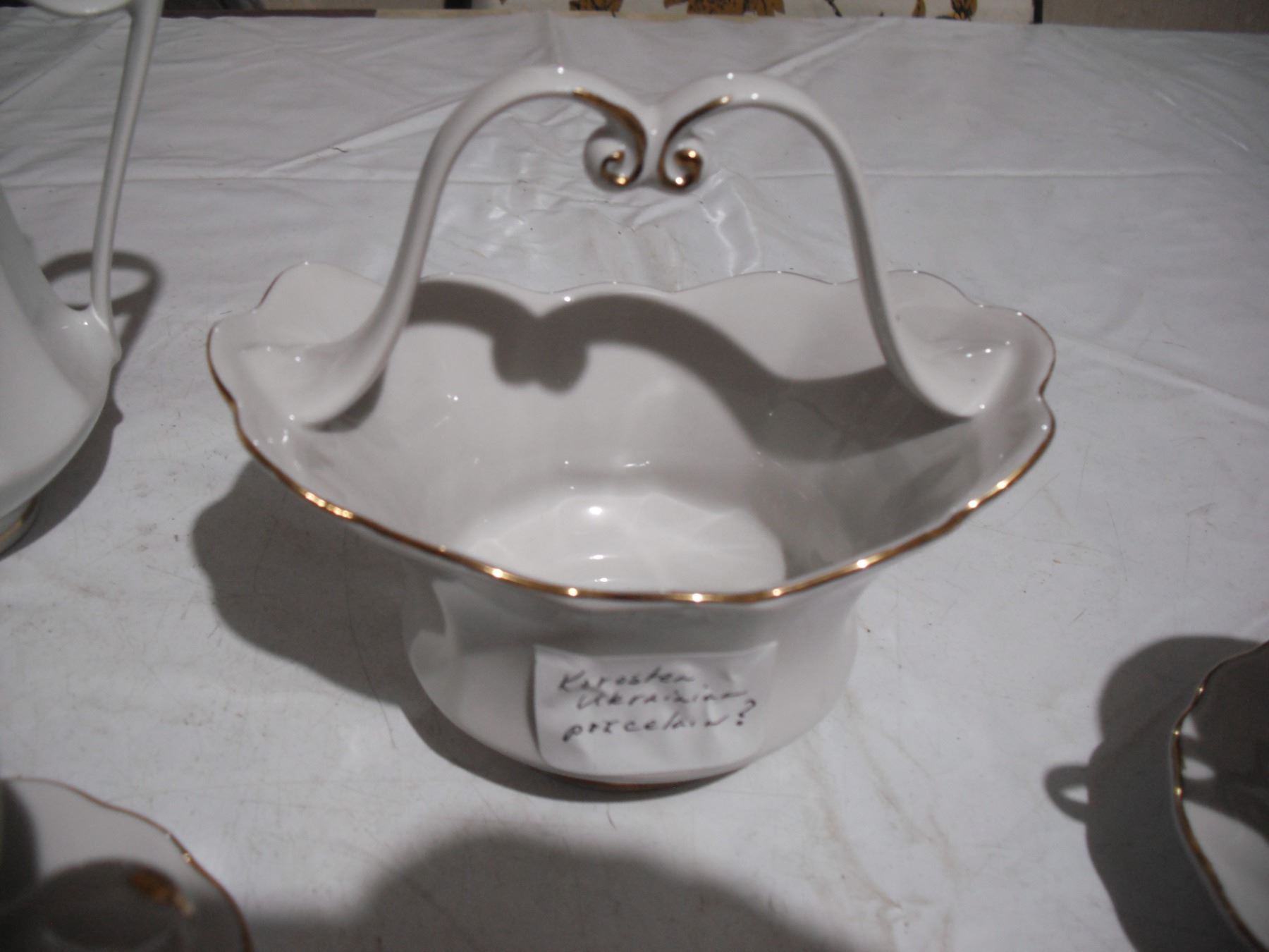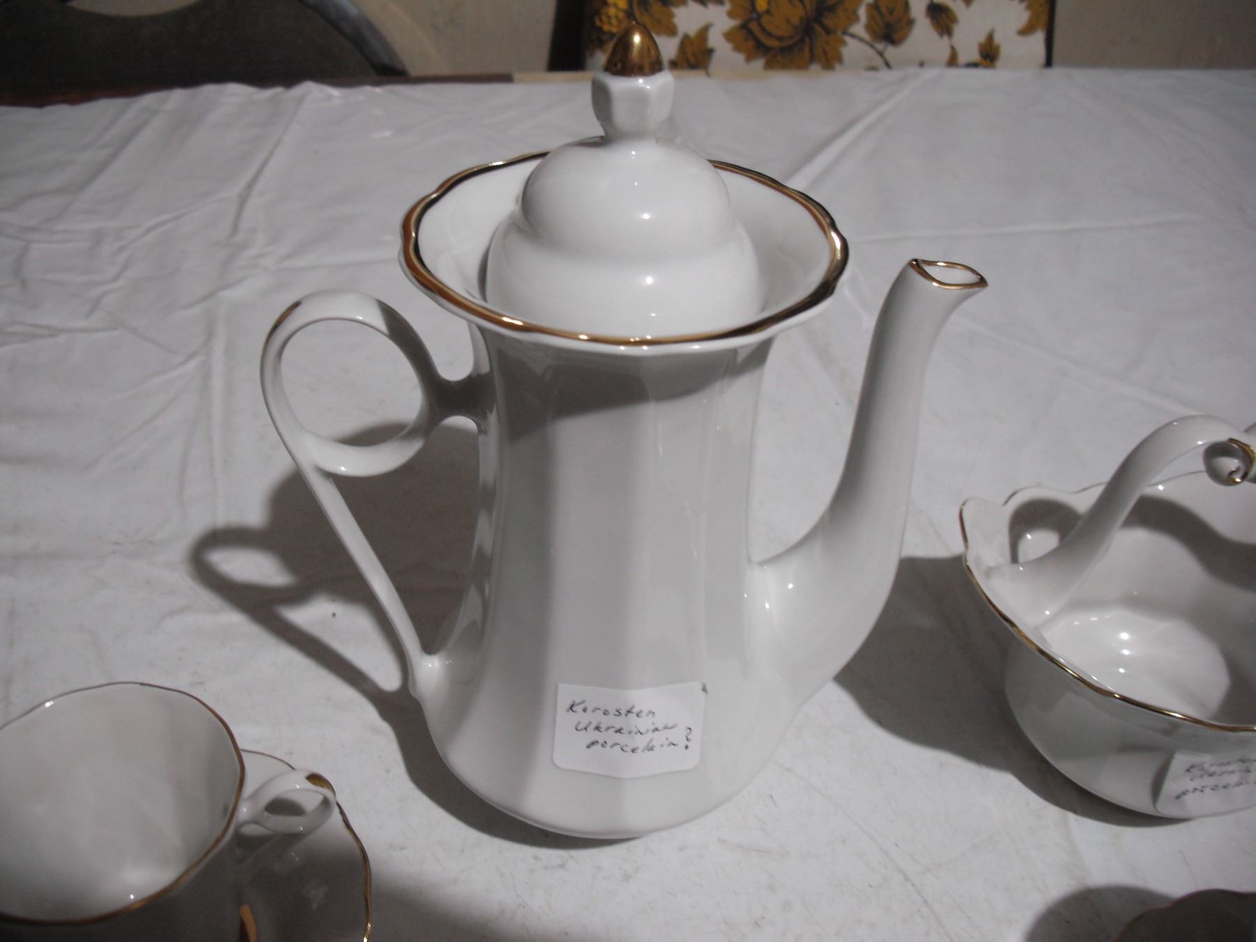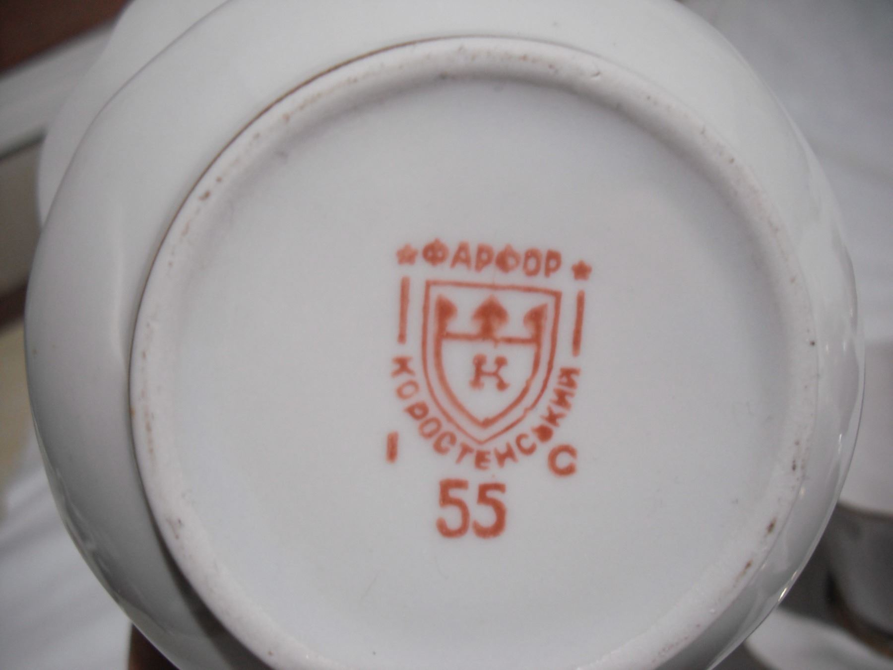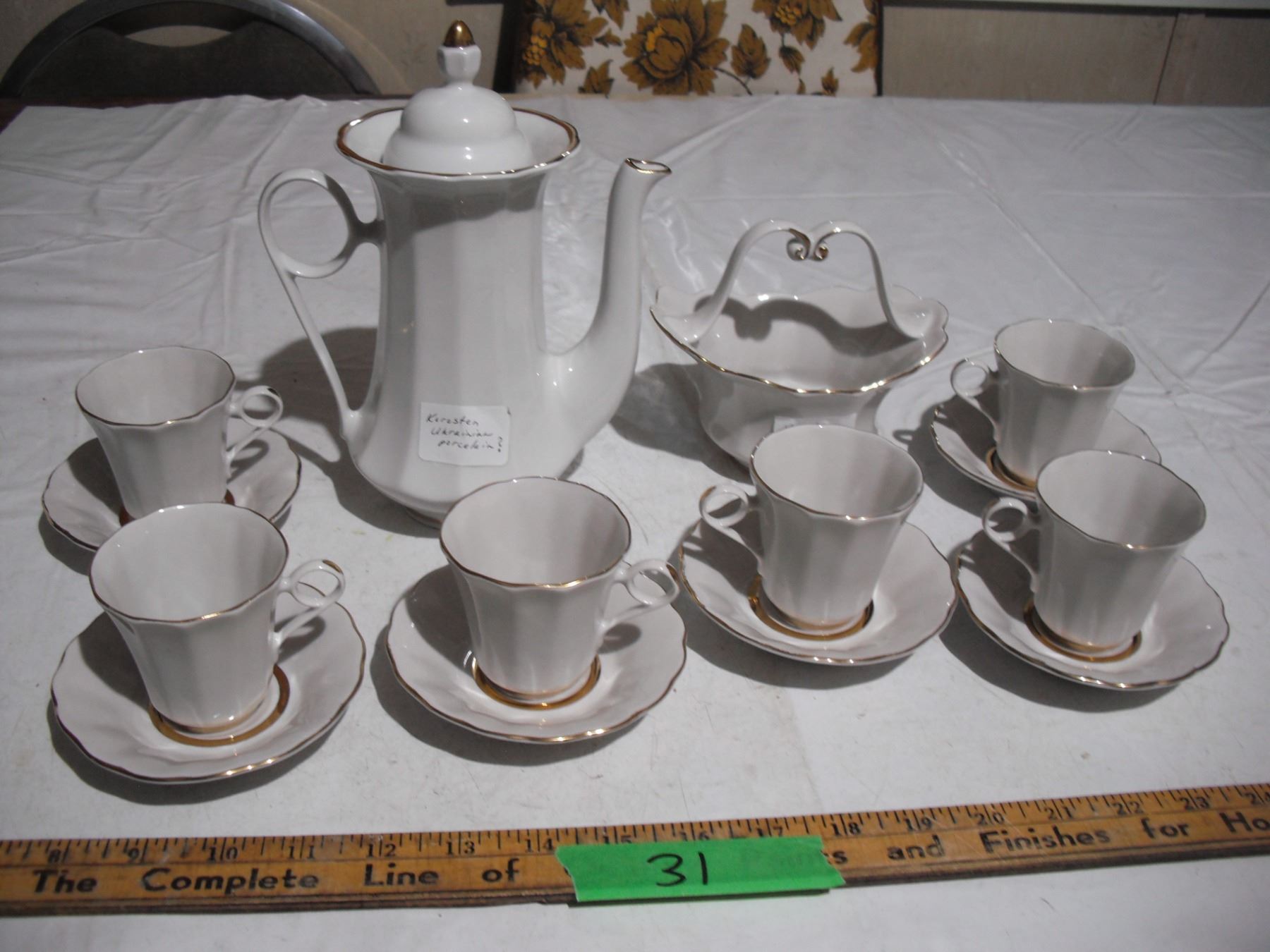 vintage ukrainian (korosten?) - tea pot, (6) cups, (6) sauces + candy dish basket (good condition)