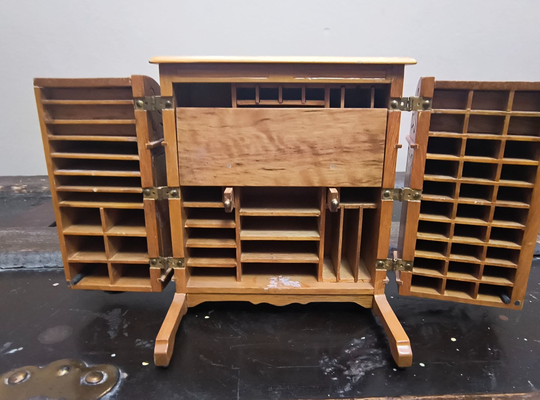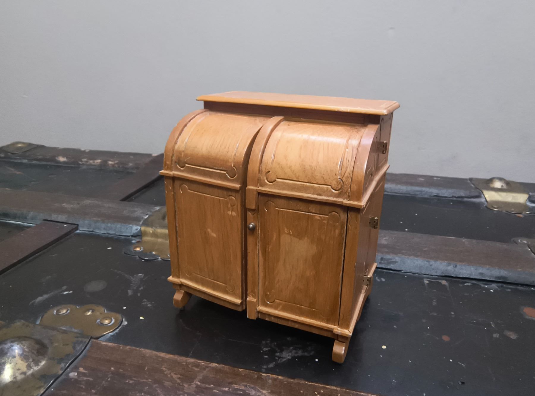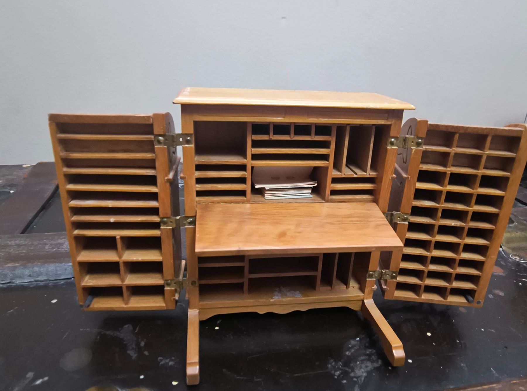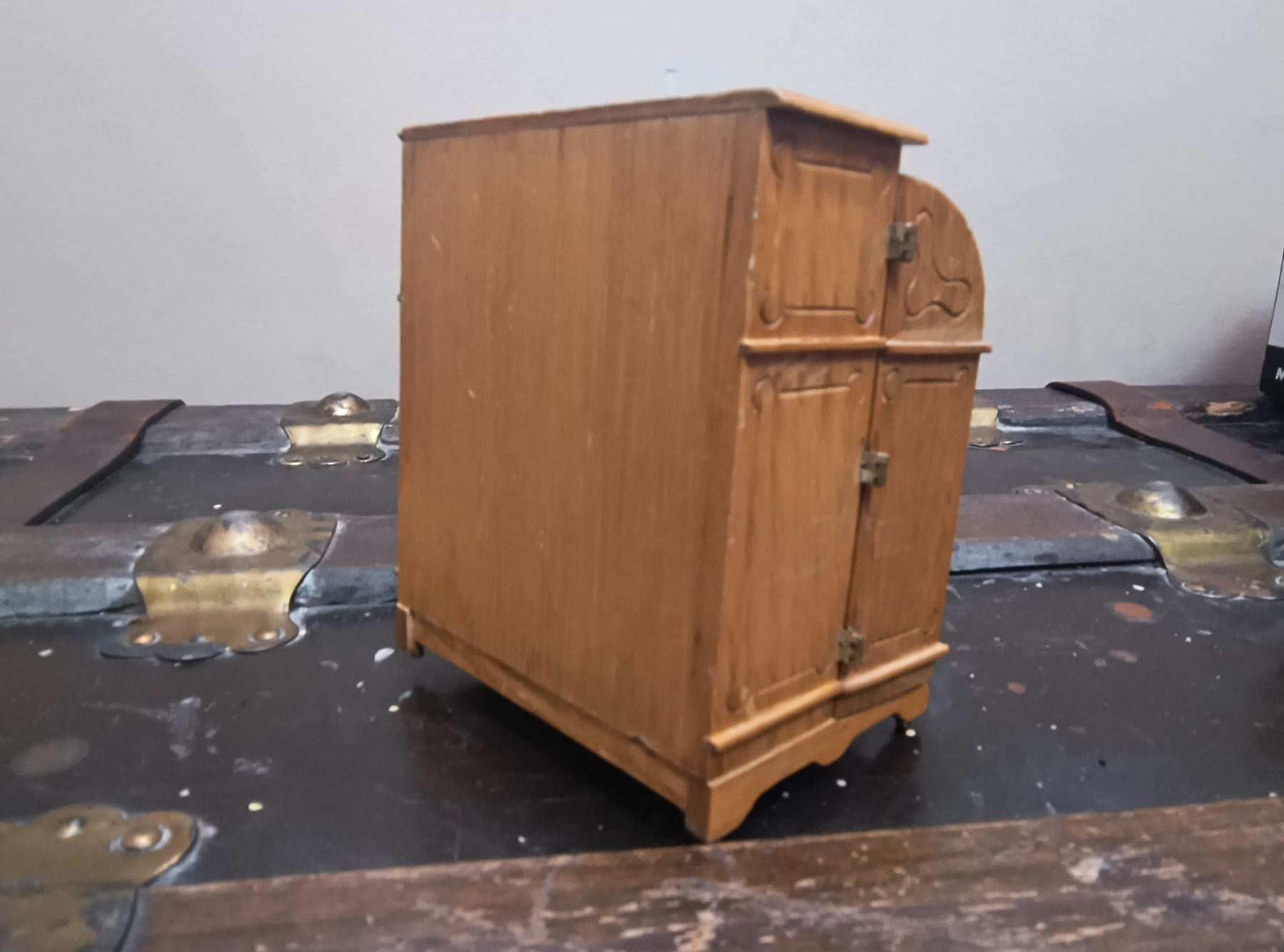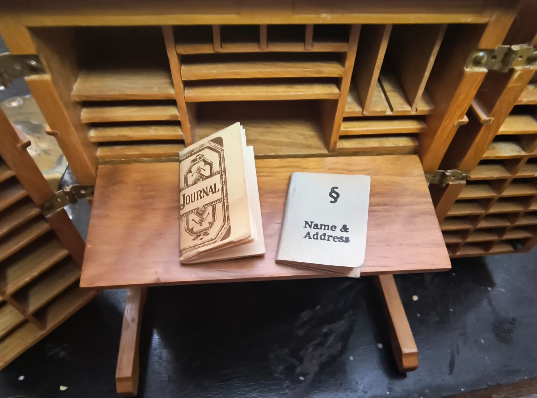 vintage wooden mini secretary desk/cabinet with 2 small books - 4" tall