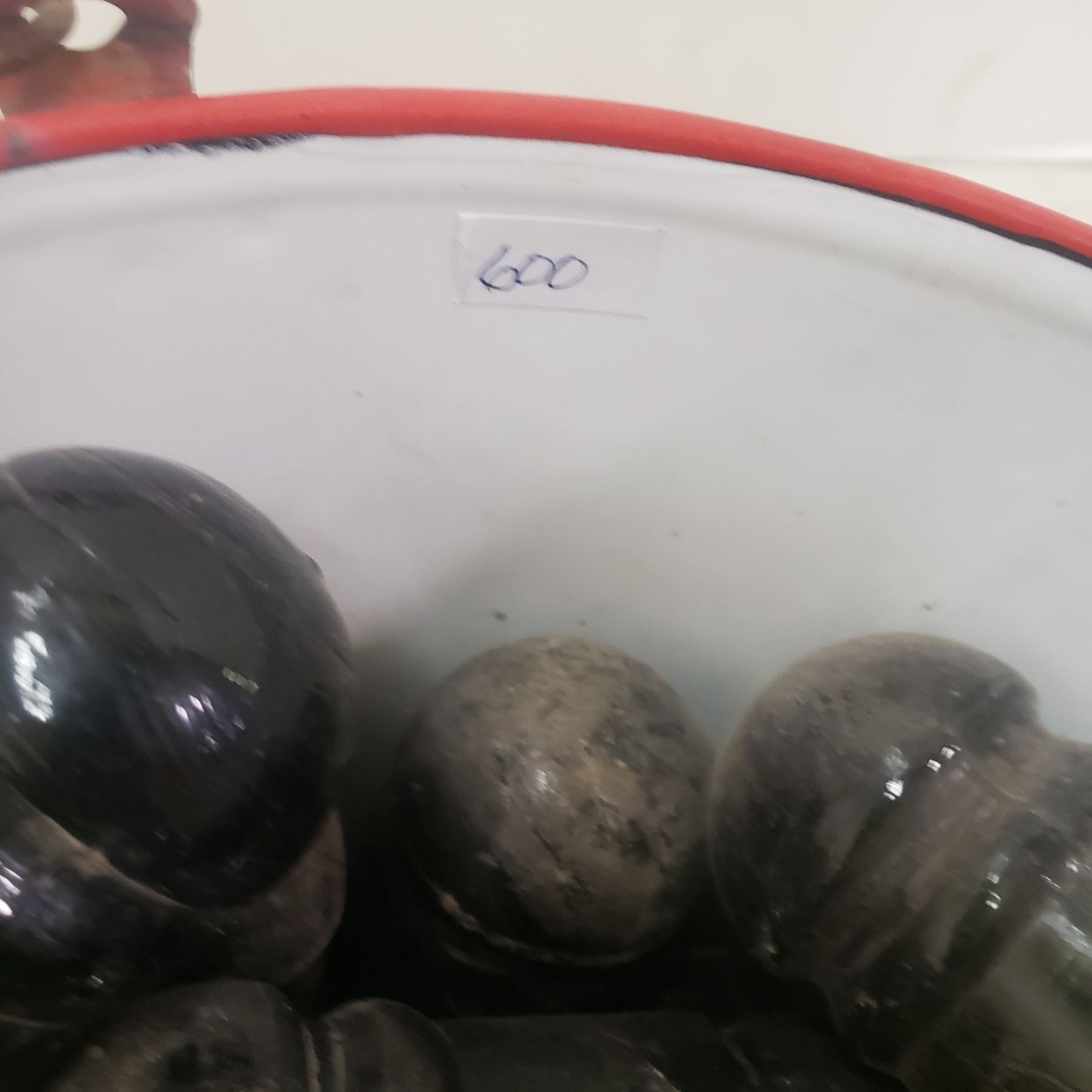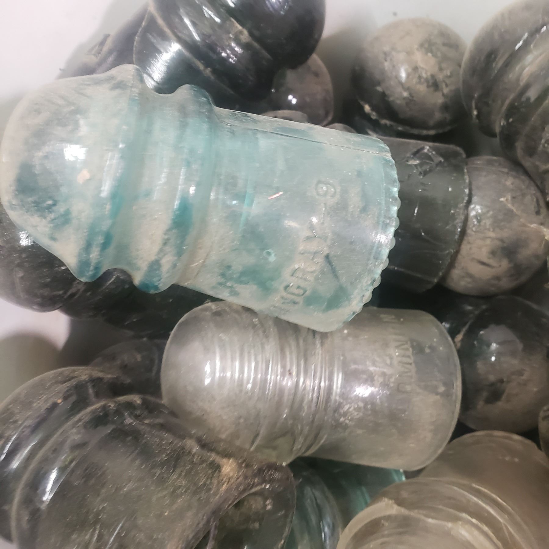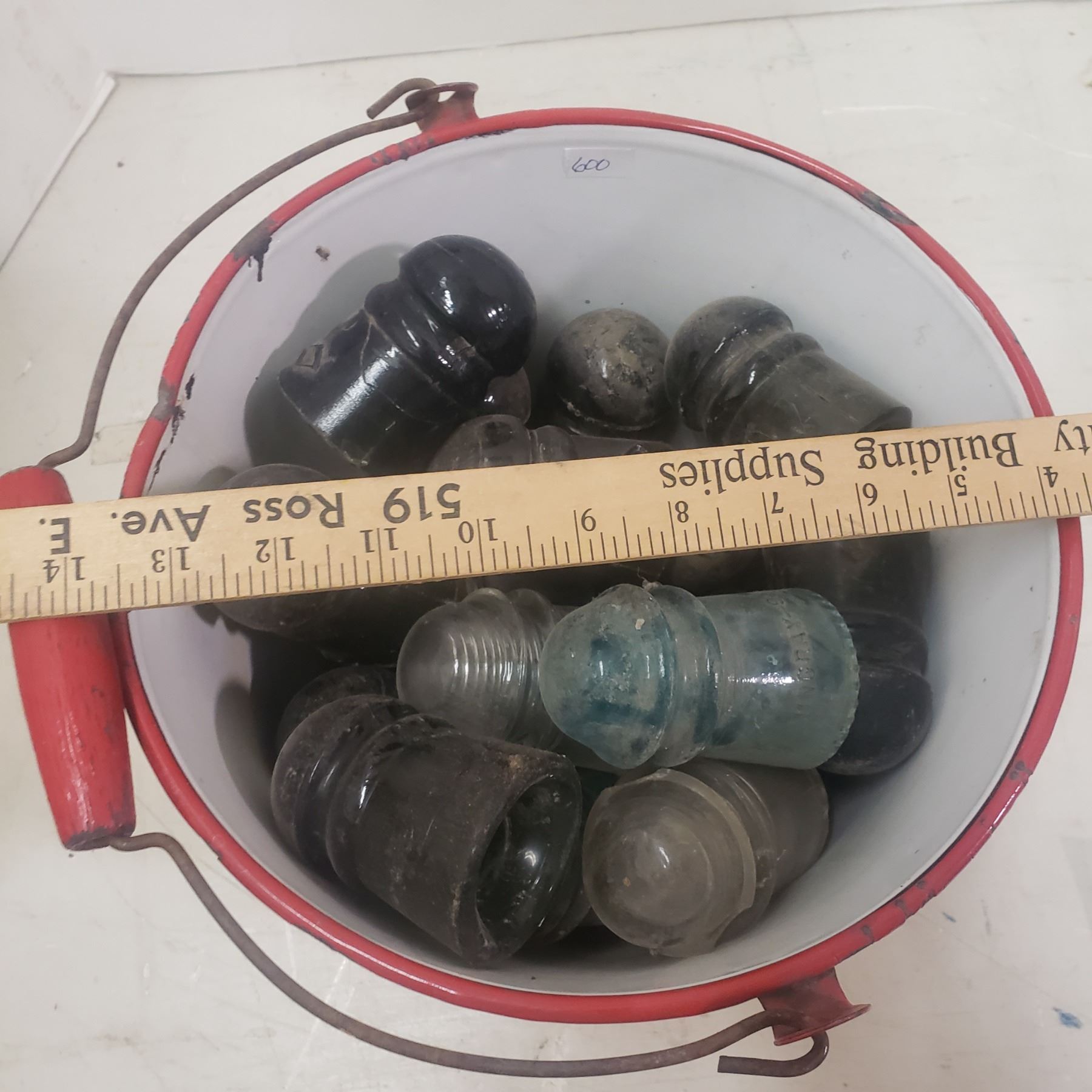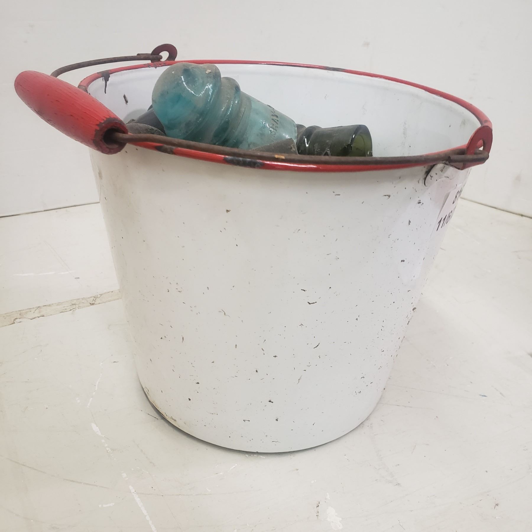 white metal Pail full of insulators glass insulators