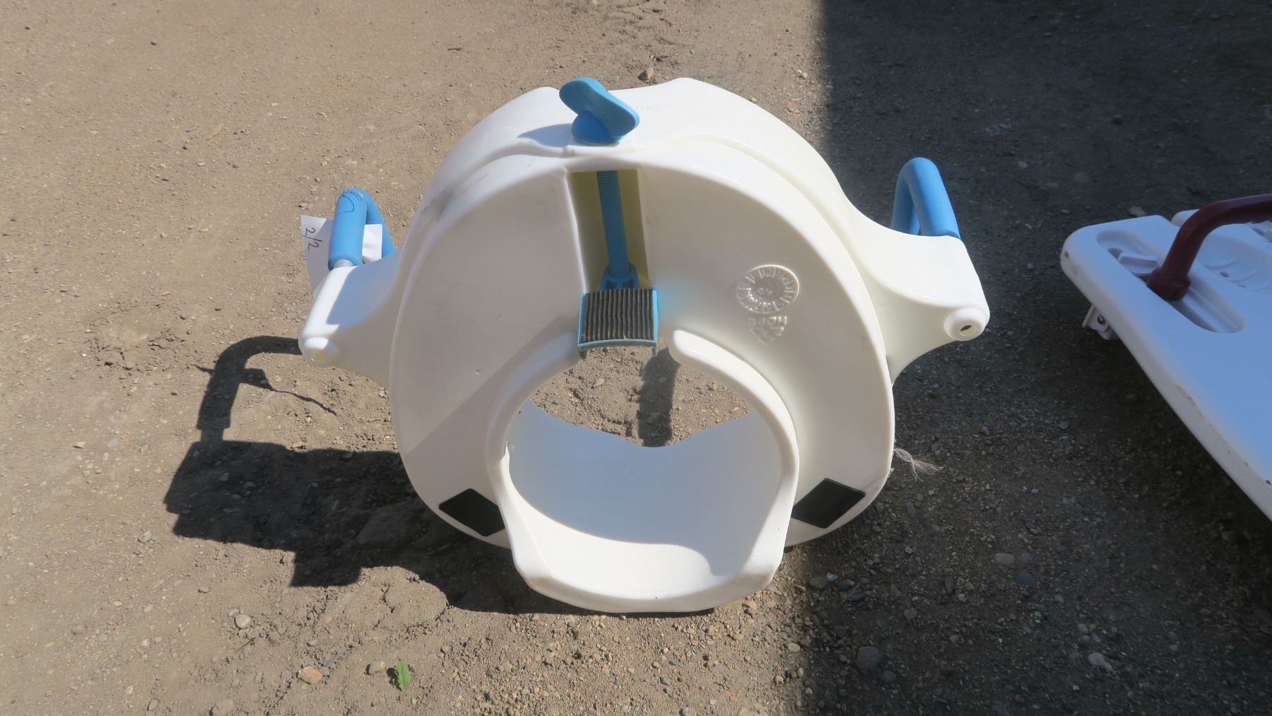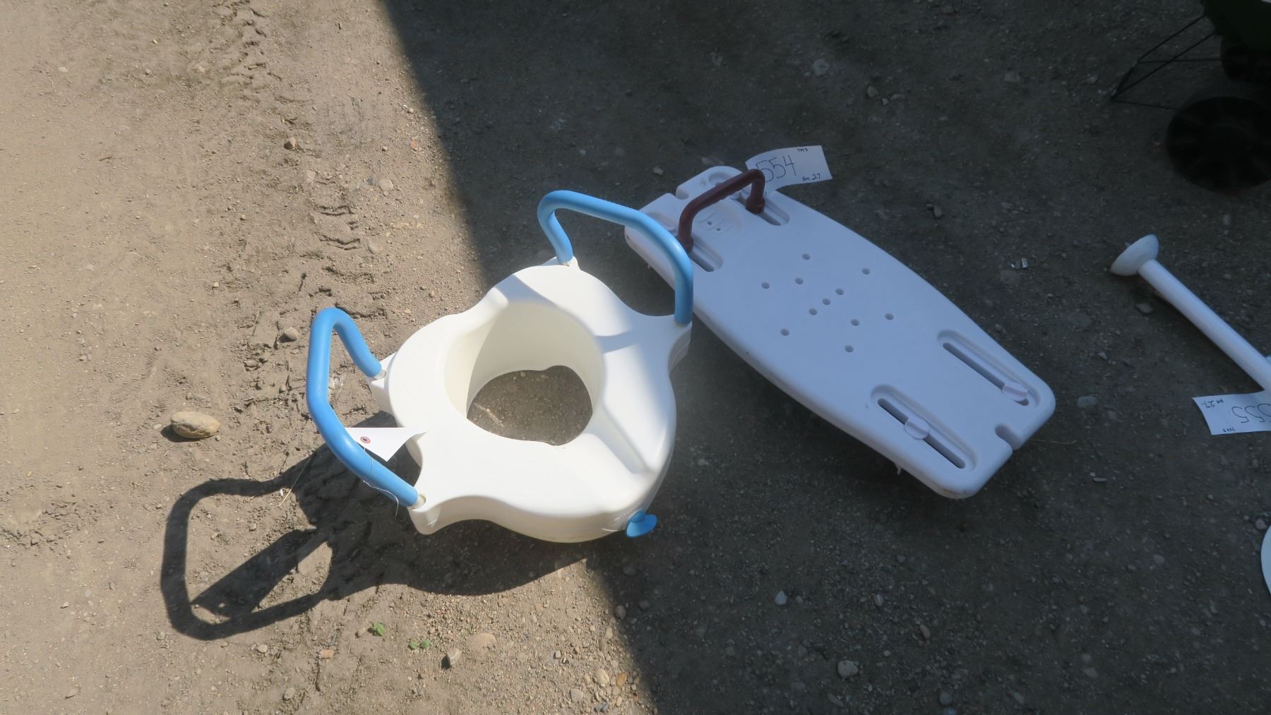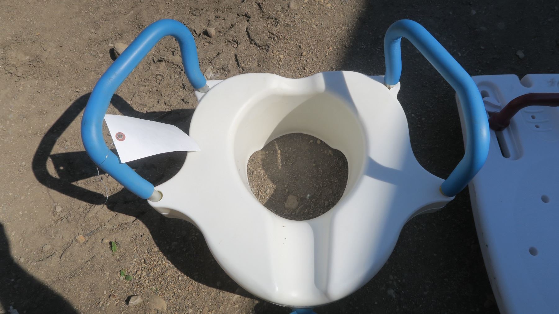 white shower seat, potty with handles.