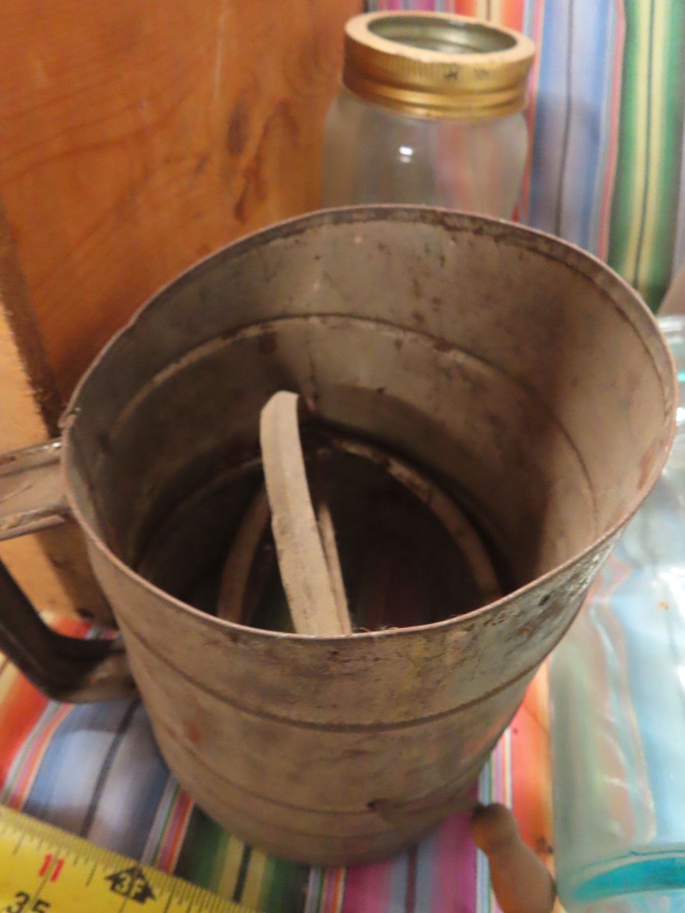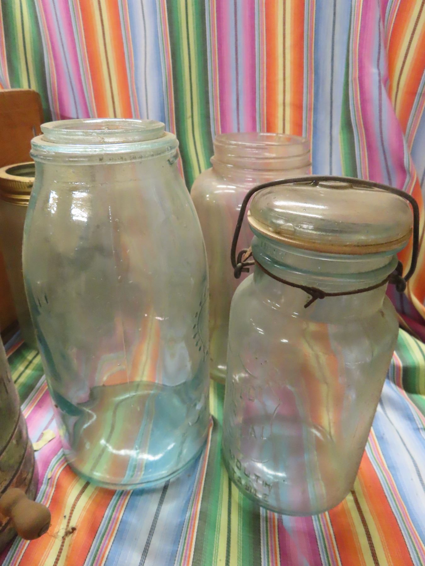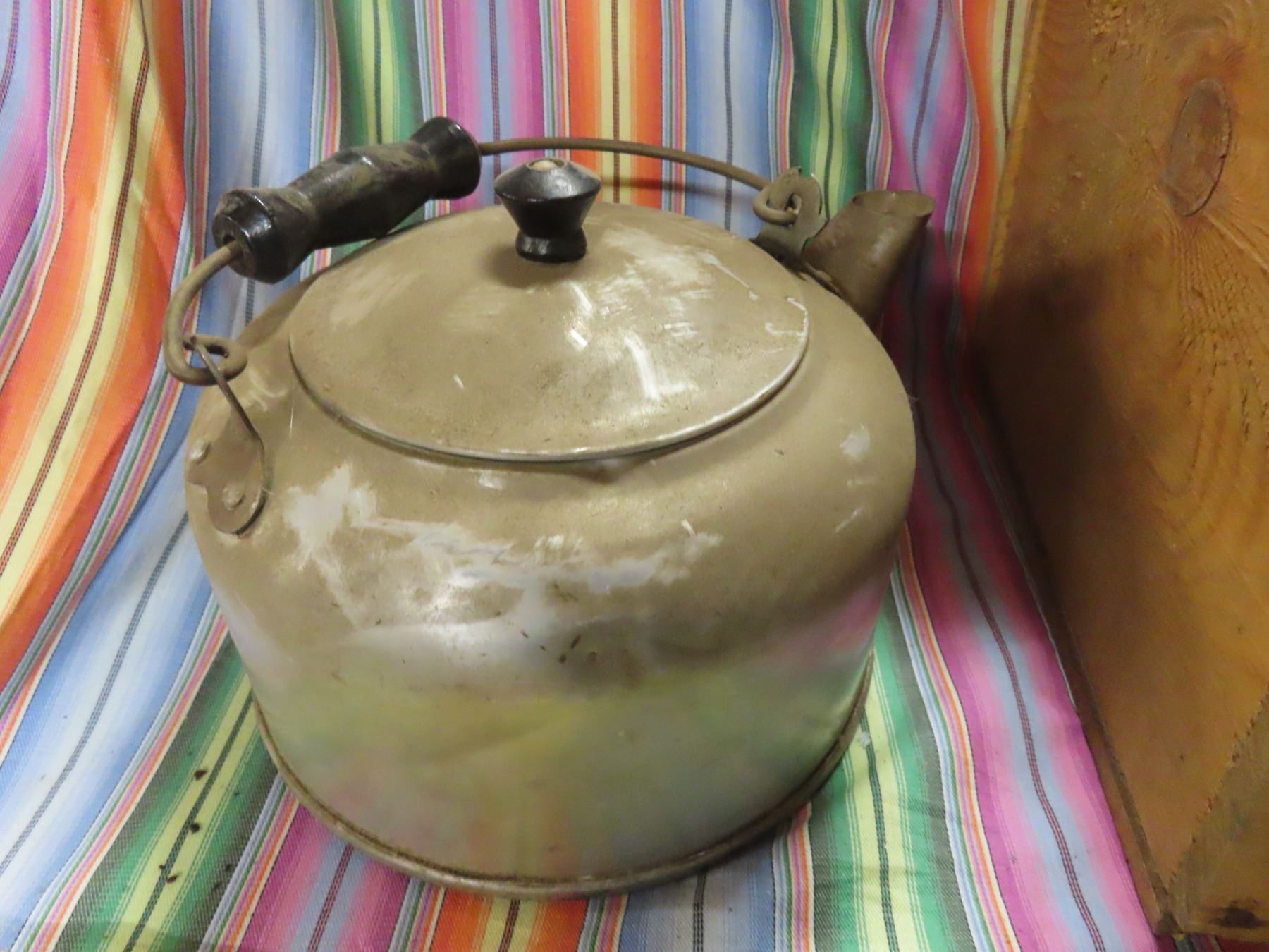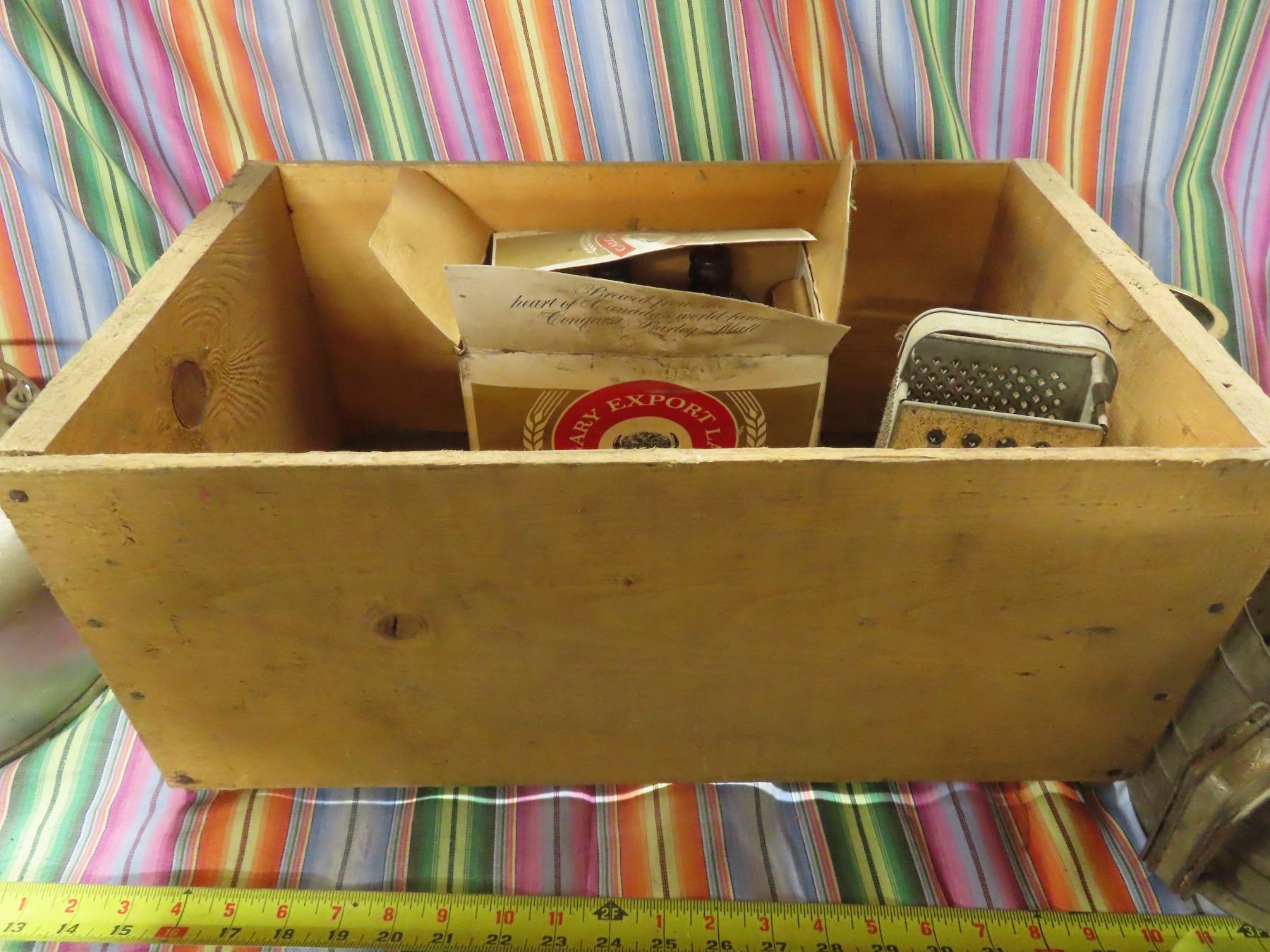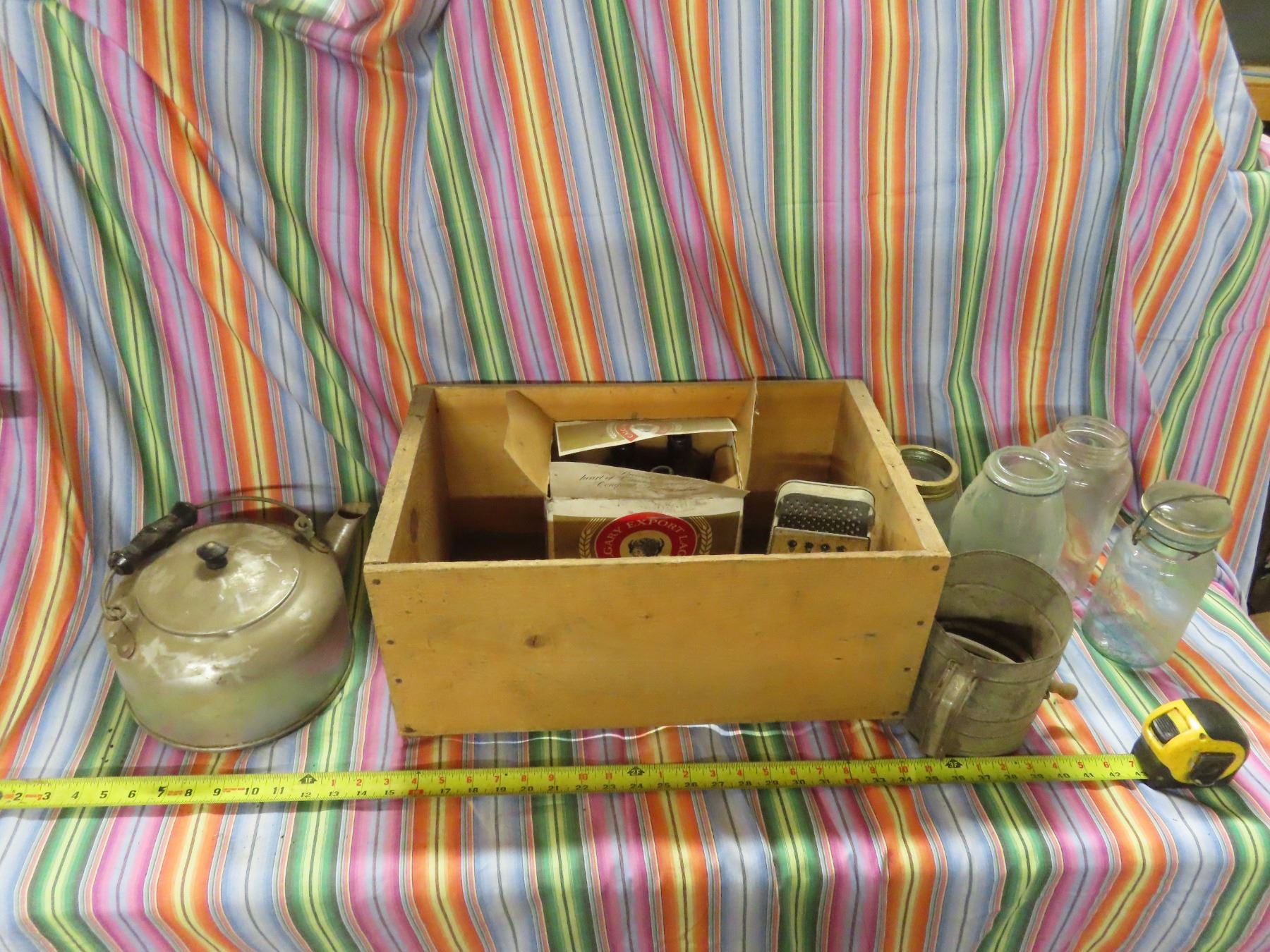 wooden box with antique jars , 2 blue antique flour sifter , kettle
