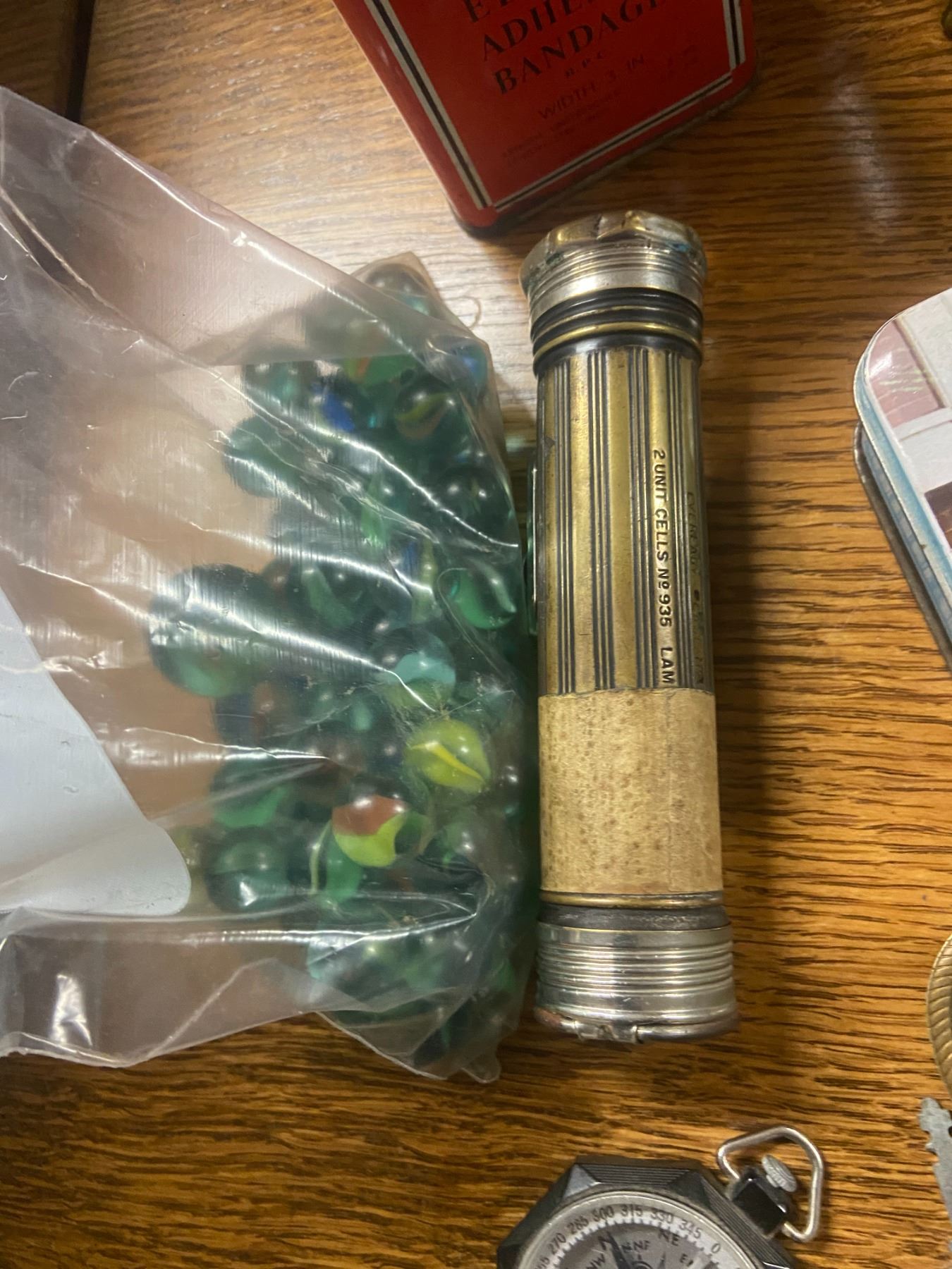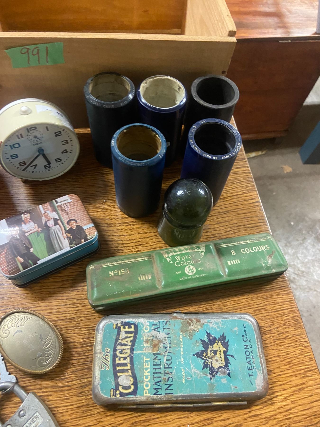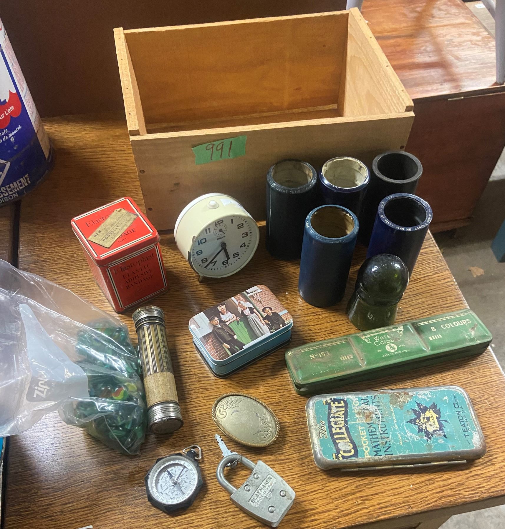 wooden crate of collectibles, marbles, tins, cylinder records, lock etc